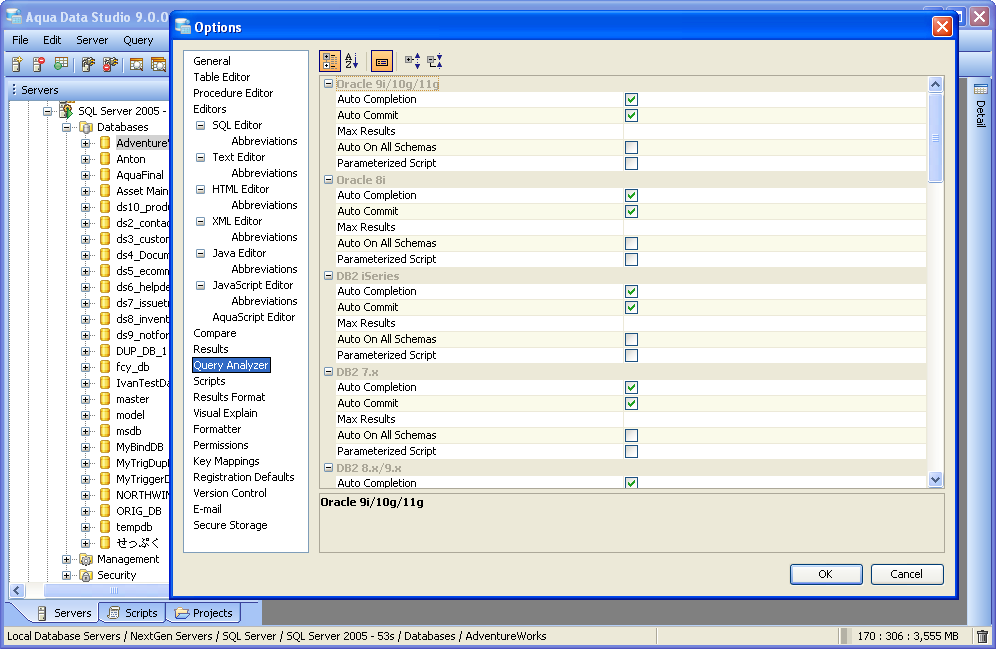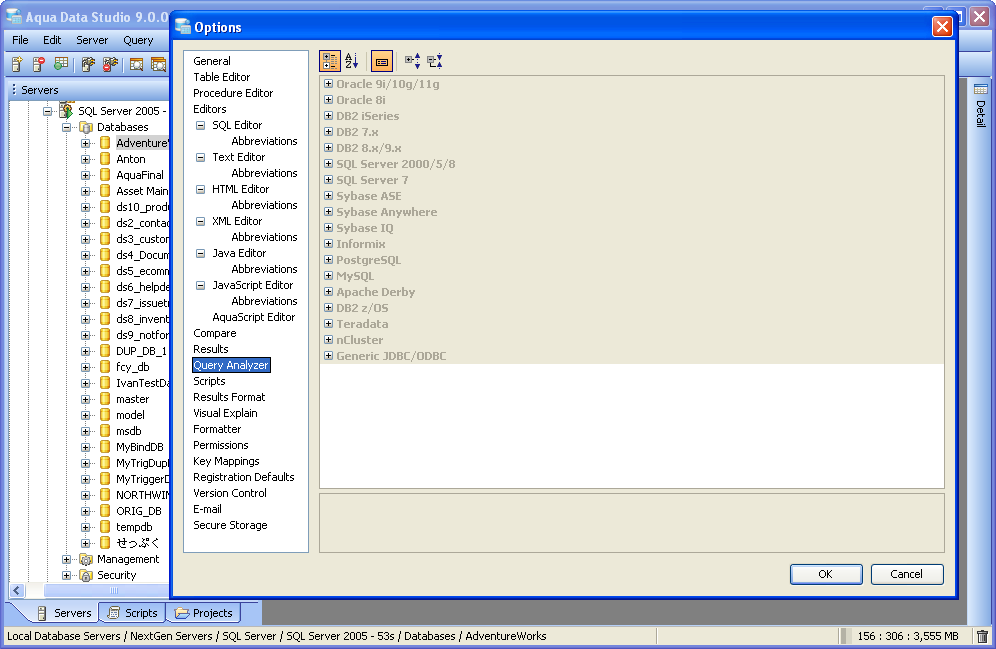 All of the above operations launch the Query Analyzer Tool, which lets you execute SQL Queries in the Database Server you are connected to. Within the Query Analyzer is a dropdown for picking other databases on the currently connected server. Multiple Query Analyzers can be open at the same time in tabs or within additional free floating Query Analyzer Windows. Editing Properties of a Query Analyzer in Aqua Data Studio The properties of the Query Analyzer can be viewed and altered by selecting File->Options->Query Analyzer from the main menu . There are defaults set for the Query Analyzer in the Options Dialog, depending on the database vendor and version chosen. The preset defaults for each vendor and version have been selected based on previous user experience and supporting database documentation.