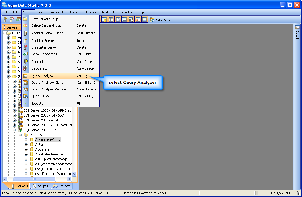 After Registering a Server in Aqua Data Studio the Query Analyzer can be launched to execute and edit SQL. There are different methods of invoking the tool, all of which launch the Query Analyzer. It is best to navigate to the server and left click to select it in the Schema Browser first, to ensure the apporpriate database is being used before beginning.