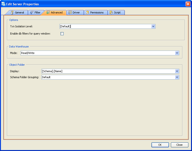 Edit the Server Properties, to use FILTER options for a Server in Aqua Data Studio: