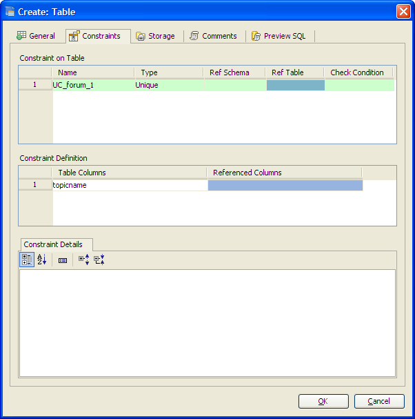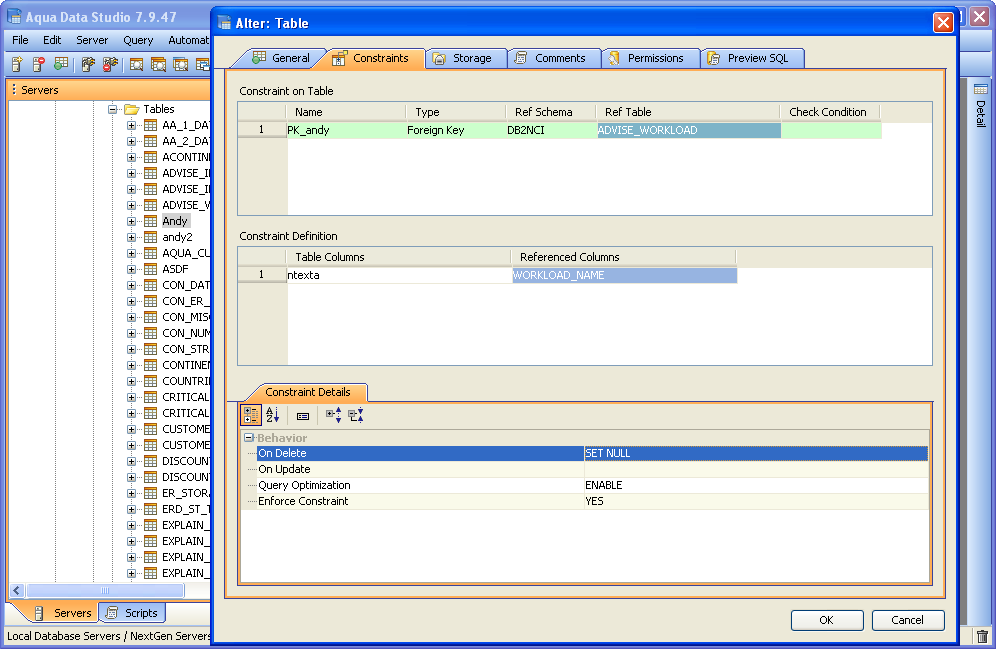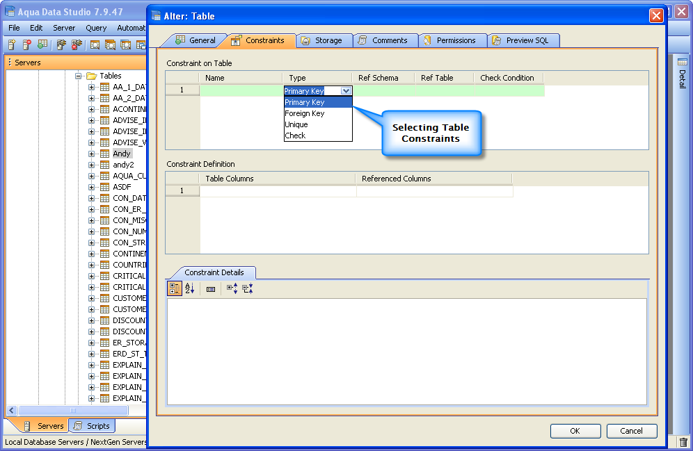 Aqua Data Studio provides visual editors for creating and editing database table Constraint objects. Constraints can be visually edited through the Create Table and Alter Table property windows, launched from a right click in the Schema Browser. Within the Alter and Create Table property windows, the Constraints Tab allows selection and editing of Table Constraints for Primary Key Constraints, Foreign Key Constraints, Unique Constraints and Check Constraints. After constraints have been set in the Constraints Tab, the Preview SQL tab displays the DDL used to generate them. When ER Models are generated from databases in the Schema Browser, constraints are visible within table entity objects. Primary Key Constraints A Primary Key is a candidate key to uniquely identify each row in a table. A table is allowed one Primary Key constraint, and a column that is part of the Primary Key constraint cannot take null values. Because Primary Key constraints ensure unique data, they are most often defined on an identity column. To create a Primary Key Constraint, enter a Primary Key Name in the name column of the Constraints table, then select Primary Key from the Type Column dropdown. In the Constraint Definition pane, select the table columns from the table that are part of the Primary key. A Primary Key Constraint is represented by a table icon with gold node when viewed in the Constraints container in the Schema Browser. Foreign Key Constraints A Foreign Key is a referential constraint between two tables. The foreign key identifies a column or a set of columns in one (referencing) table that refers to a column or set of columns in another (referenced) table. The columns in the referencing table must be the primary key or other candidate key in the referenced table. The values in one row of the referencing columns must occur in a single row in the referenced table. To create a Foreign Key Constraint, enter a Foreign Key Name in the name column of the Constraints table, then select Foreign Key from the Type Column dropdown. Select the Reference Schema and Reference Table. In the Constraint Definition pane, select the columns from the tables that are set in the Reference Table of the Foreign Key. A Foreign Key Constraint is represented by a table icon with gold node and black square when viewed in the Constraints container in the Schema Browser. Unique Constraints A Unique Constraint uniquely identifies all possible rows that exist in a table. Unique Constraints make sure that no identically copied values are entered in specific columns that do not participate in a primary key. Multiple Unique Constraints can exist on a single table. To create a Unique Constraint, enter a Unique Constraint name in the name column of the Constraints table, then select Unique Constraint from the Type Column dropdown. In the Constraint Definition pane, select the columns from the columns needed. A Unique Key Constraint is represented by a table icon with crossed node when viewed in the Constraints container in the Schema Browser. Check Constraints A Check Constraint (also known as table check constraint) is a condition that defines valid data when adding or updating an entry in a table of a relational database. Within the Constraints Tab of Create or Alter Table, the Check Condition column is where the condition is set, determining what the table considers valid data for the selected column. To create a Check Constraint, enter a Check Constraint Name in the name column of the Constraints table, then select Check Constraint from the Type Column dropdown. Enter the formula for the check in the Check Condition field. A Check Constraint is represented by a table icon with gold node and green check when viewed in the Constraints container in the Schema Browser. Sample Table with Constraint Types The screenshot labeled "Table with constraint types" shows the Alter Table dialog for a table from the AdventureWorks database in Microsoft SQL Server 2008. |