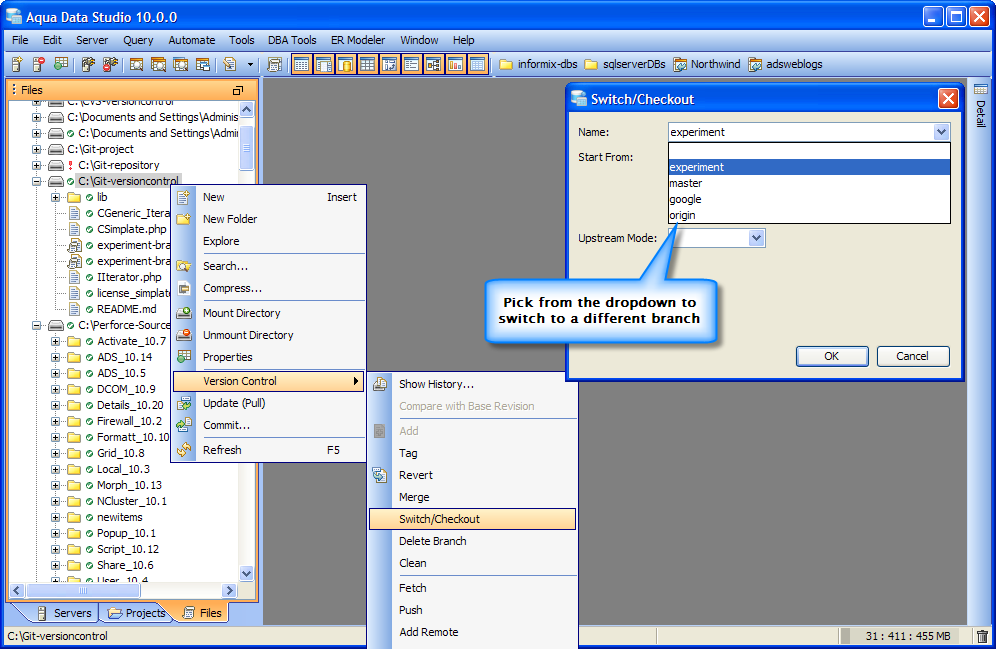 Now next time you try to "Push" this remote server will be available under the Destination Repository in the drop down. See step 2 in Push your changes to remote Git Repository in github, google projects, heroku, gitorious etc Create, Delete Branches, Switch and Checkout A single Git repository can contain any number of branches.To create a new branch using Aqua Data Studio follow the below steps
