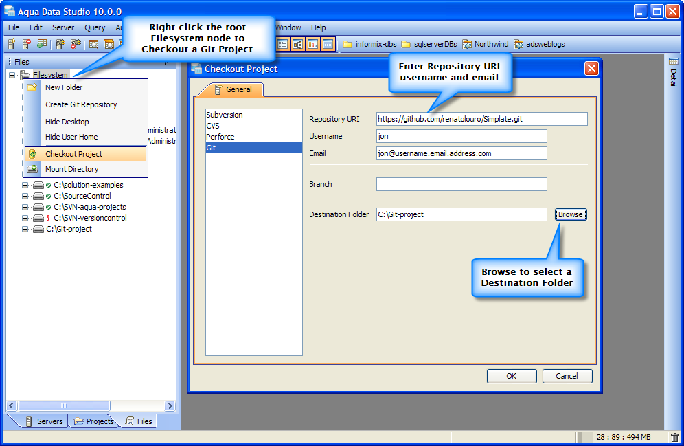 To mount and use a directory that is already part of a Git repository Step 1: Mount the Directory in the Aqua Data Studio Filesystem Tree View