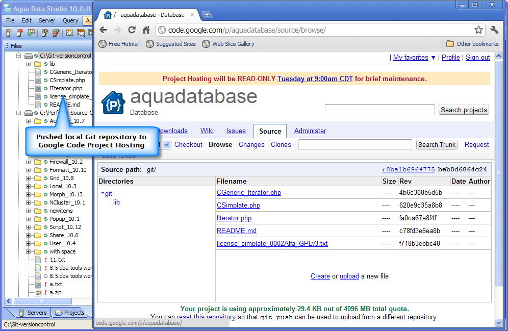 Version Control - Git Users can create a new Git repository in Aqua Data Studio and manage files or checkout remote Git projects hosted in Google Code Project Hosting, Github, Gitorious, Heroku etc. Users can also interact with the Git Command Line Options using the Open API interface AQGit under com.aquafold.openapi.vcs in the AquaScript editor. Your first GIT Repository using Aqua Data Studio With Aqua Data Studio, you can create a GIT repository and be up and running in 1 easy step Set up a GIT repository (bare)