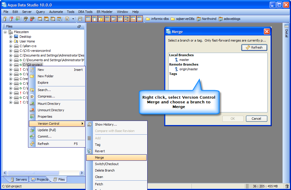 Merge changes from a selected commit to your current branch using Aqua Data Studio Suppose you created a new development branch named Experiment from the original branch Master. Using Merge feature in Aqua Data Studio, you can now merge changes made on your current branch since it diverged from master until its current commit on top of master.