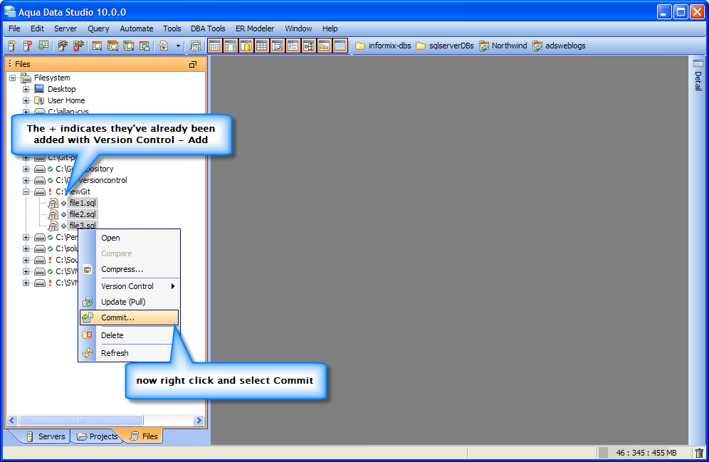 This will successfully configure your GIT repository with Aqua Data Studio. To test if you have successfully created the GIT repository using ADS, right click on the directory and select option Explore. If you see a hidden folder .git, then you have are now ready to check in your files and commit. Every git repository is stored in the .git folder of the directory in which you create the git repository. directory. This directory contains in the .git/config the local configuration for the repository and the complete history of the repo. Add files and Commit