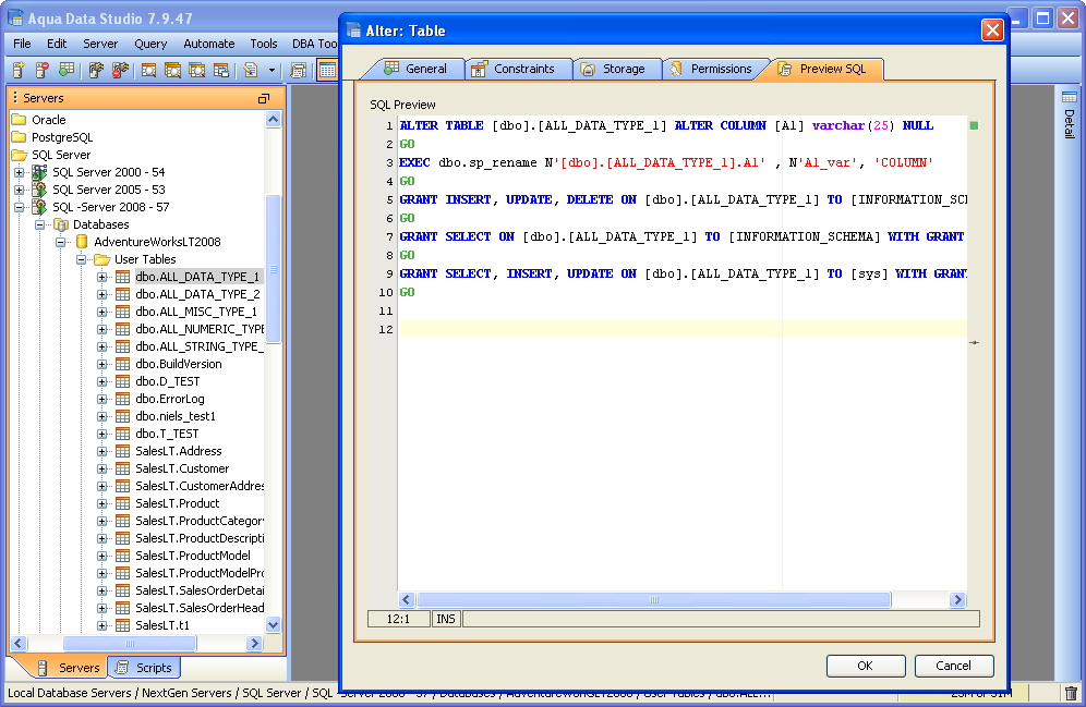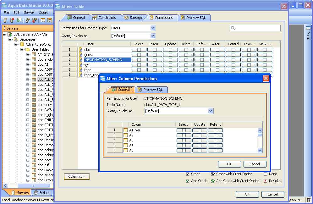 Once a table has been created, it is possible to use Aqua Data Studio's Visual Editing Tools to alter its properties. ALTER Altering tables through the GUI is also done with a right click menu on table objects in the schema browser. Right clicking on a table object opens the same popup menu as above, but to ALTER a table, select the second item in the list, "Alter Table". The resulting Alter Table window contains General, Constraints, Storage, Permissions and Preview SQL tabs across the top. Within the General tab, the table name, column names, datatypes and allow nulls can be changed. The Column information is sortable, expandable and displays more details about the selected columns. INSERT and DELETE of columns is available via right click on the Column Names within the General tab of CREATE and ALTER dialogs. The database and schema cannot be changed, and remain grayed out. Columns can be added (INSERT), deleted (DELETE) and changed (ALTER). Constraints and check conditions can be altered in the Constraints tab. Constraint properties details such as Name, Type, Ref Schema, Ref Table and Check Condition are modifiable visually. Constraint Definition Table Columns and Referenced Columns can be visually edited Storage information, just as above, can be altered in the Storage tab. The Storage tab provides details on Tablespace and table storage, its content vary depending on server vendor and version. Table Permissions (when privileges to do so have been granted to the current user in the server registration Permissions tab) can be altered and granted on the Permissions tab for column and command. Full grant options are available and all Permissions can be set by Grantee Type for Users, Groups or Roles depending on database vendor and type. Grant, Grant with Grant Option, Add Grant, Add Grant with Grant Option, and Revoke are available for SELECT, INSERT, UPDATE, DELETE across all databases. Depending on vendor supported functionality, there are other permissions which may be set such as ALTER, INDEX, References, On Commit Refresh, Query ReWrite The "Columns..." button at the bottom right of the Permissions tab, allows further permissions changes, including SELECT, INSERT, UPDATE, and References for the columns highlighted in the permissions grid within the Permissions tab. The Preview SQL tab displays the DDL used to alter the table based on the properties set within the other tabs. Below are the steps to alter a table.