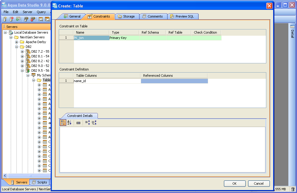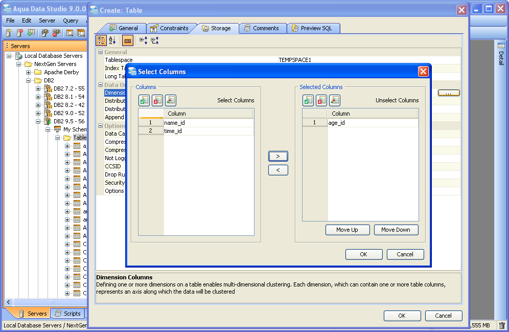 Aqua Data Studio contains GUI tools for visually editing and creating Tables. CREATE Creating tables through the GUI Tools available in the schema browser begins with opening a database server connection and expanding the tree to view the server's tables. Right clicking on the schema container for Tables generates the pop-up menu containing "Create Table" as its first item. The Create Table dialog has General, Constraints, Storage and Preview SQL tabs across the top. The General tab is where the table is named and its columns and datatypes are set. The Column information displays more details about the selected columns in the descriptin area below the column grid. INSERT and DELETE of columns is available via right click on the Column Names within the General tab of CREATE and ALTER dialogs. All of the datatypes available to the current database can be accessed with a dropdown next to the column names. The Constraints tab allows selection of columns for use in constraint creation (including Primary Key) and check conditions. Constraint properties details such as Name, Type, Ref Schema, Ref Table and Check Condition are modifiable visually. Constraint Definition Table Columns and Referenced Columns can be visually edited. For more on constraints, see the Creating Constraints page. The Storage tab provides details on Tablespace and table storage, its content vary depending on server vendor and version. The Comments tab provides space for text comments that will be stored with the table in the database. Some vendors also allow Table Column Comments, to make comments on specific columns. Where this is available, such comments will also appear ER Models containing tables with these properties. The Preview SQL tab displays the DDL used to generate the table and its properties based on the settings of the other tabs. Below are the steps used to create a table in DB2 9.5. Because other databases may not have dimensions, steps 6 and 7 may not be needed.
