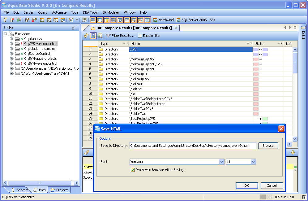 Launching the Directory Compare Tool The Directory Compare Tool provides users a method of depicting differences in the content of directories. To compare two directories, either multi-select individual directories in the Files Browser from mounted directories, or launch the Directory Compare Tool from Tools Menu (Tools->Compare->Directory Compare) and browse to them. If the Directory Compare Tool is launched from the Tools Menu, it is possible to choose directories that are not listed in the Files Browser, but are available to the operating system. It is also possible to drag items into the application from the operating and drop them off on the Directory Compare Tool selection window. Filters to exclude files by file size, name, directory, or file extension can be selected before the comparison is run using the "Show Differences" button. The Directory Compare Tool keeps the last directories selected when the application is restarted and the Directory Compare Tool is relaunched. When the comparison is being performed the status bar indicates its progress and runs in a background thread so that other operations in Aqua Data Studio can be performed. Comparison Results The results of a comparison display as a split-pane with line numbering down the center and connecting splines for identifying where the deletions, changes and additions occur. Each file in a comparison takes up half of the comparison results window and each can be vertically scrolled independently of the other. At the top, between the two files above the line numbering, digits separated by a / indicate the difference selected out of total number of differences discovered (i.e. 9/27). The large up and down arrows at the top of the comparison results allow navigating through the differences one at a time. Comparisons show the character differences in a modified line with bolding and background color highlights indicate modified blocks. The file and directory listing for a resulting comparison has columns for type, name, state, left file size, right file size and difference count. These columns can be sorted one at a time by Ctrl +click on column headers. Their position left to right can be reorganized by dragging them into new positions. When a particular item in the comparison results is selected, details about its differences are displayed in the preview panel at the bottom. If they are not identical they are highlighted by default in pink (deleted), purple (changed) or green (added). The colors for the difference highlighting can be changed with the Options button at the top right of the comparison results Preview Panel. The Search button at the top left of the comparison results Preview Panel is useful for finding and highlighting specific content in the item selected in the comparison results. Annotation Bar The annotation bar provides a bird's eye view of all of the differences detected in a comparison. When differences are found, their corresponding highlight colors appear in the annotation bar on the right side of the results and can be used to quickly navigate to them. If a marker in the annotation bar is used to navigate to a particular difference by left clicking, a tick mark overlay shows which difference currently has focus. Once the comparison is complete, it can be refreshed, allowing the same comparison to be run again. It is also possible to select two new files for comparison by clicking the "Browse" buttons at the top of the comparison results without having to launch the Compare Tools Menu again. Comparison Filters When the "Enable Filters" checkbox is checked filters can be run on the existing comparison to help locate specific differences. The "Filter Results" button launches the Filters dialog, and the checkbox next to it runs those filters on the current comparison. Object Types of directory or file can be filtered within the Filter dialog for names and wildcards. If all that is needed is a viewing of the files which are different, checking "Directories" (to exclude directories in the comparison) and checking "Both Different" will show only those files that are different in both directories. Directories or Files or both can be filtered for when: