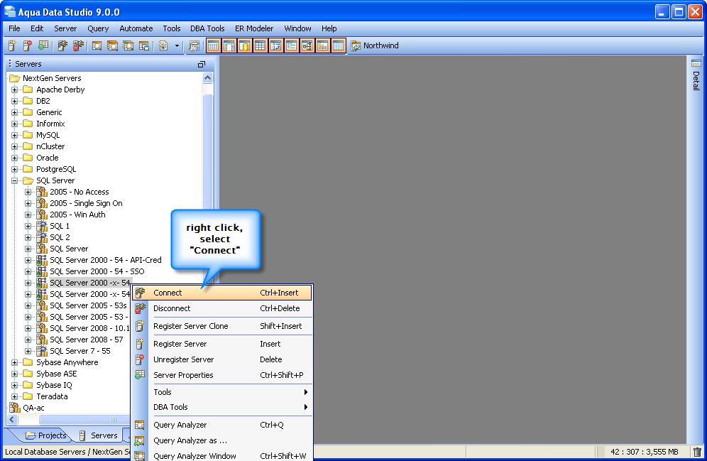 Select the Database Server you want to connect to and use the keyboard combination "CTRL + INSERT" to quickly Connect to the Server