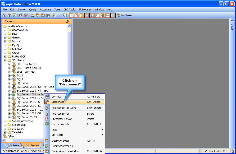 Select the Database Server you want to disconnect and use the keyboard combination "CTRL + DELETE" to quickly Disconnect from the Server