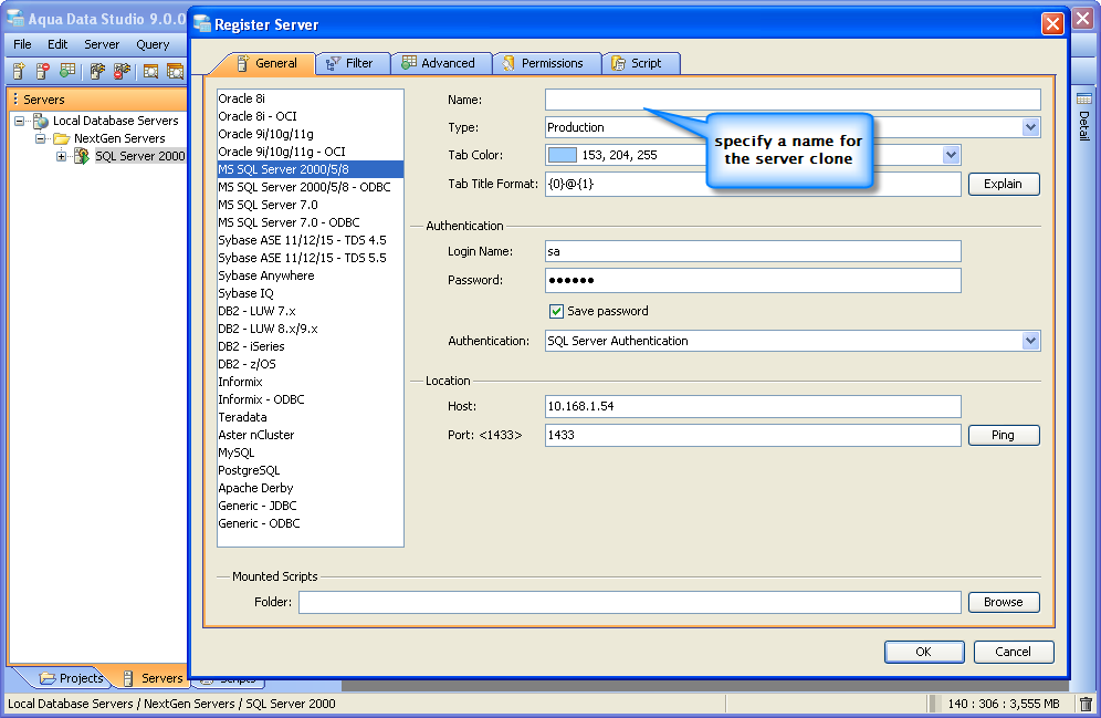 To create a Server Clone of an already Registered Server in Aqua Data Studio