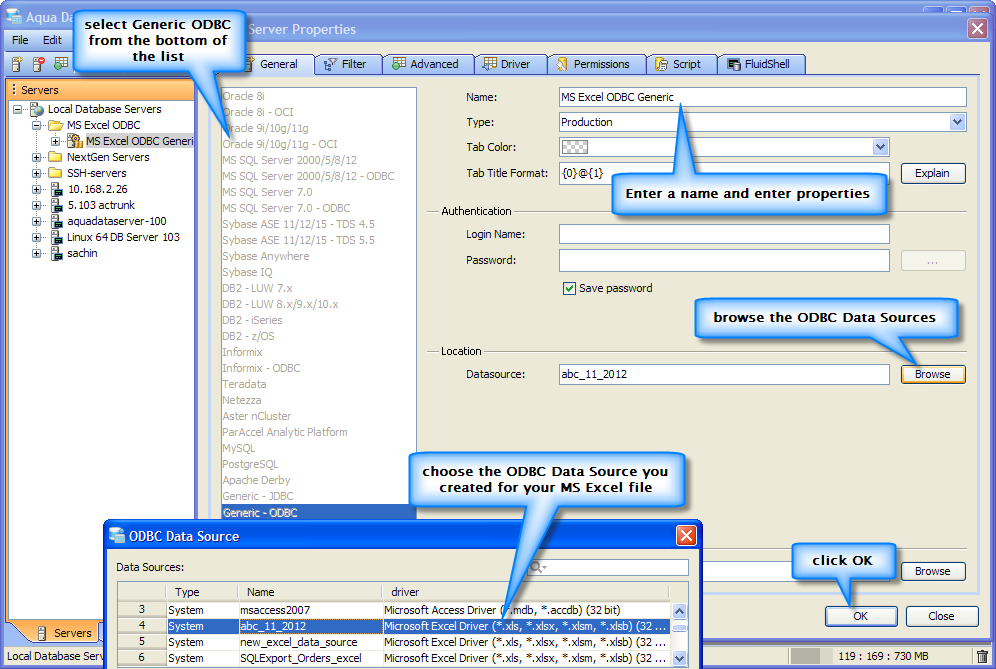 To connect to a Microsoft Excel ODBC Datasource using Aqua Data Studio Generic ODBC: