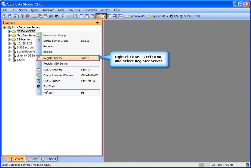 The Microsoft Excel ODBC Data Source is registered successfully in Aqua Data Studio. You can now connect to the newly registered Server and perform Data Manipulations.
