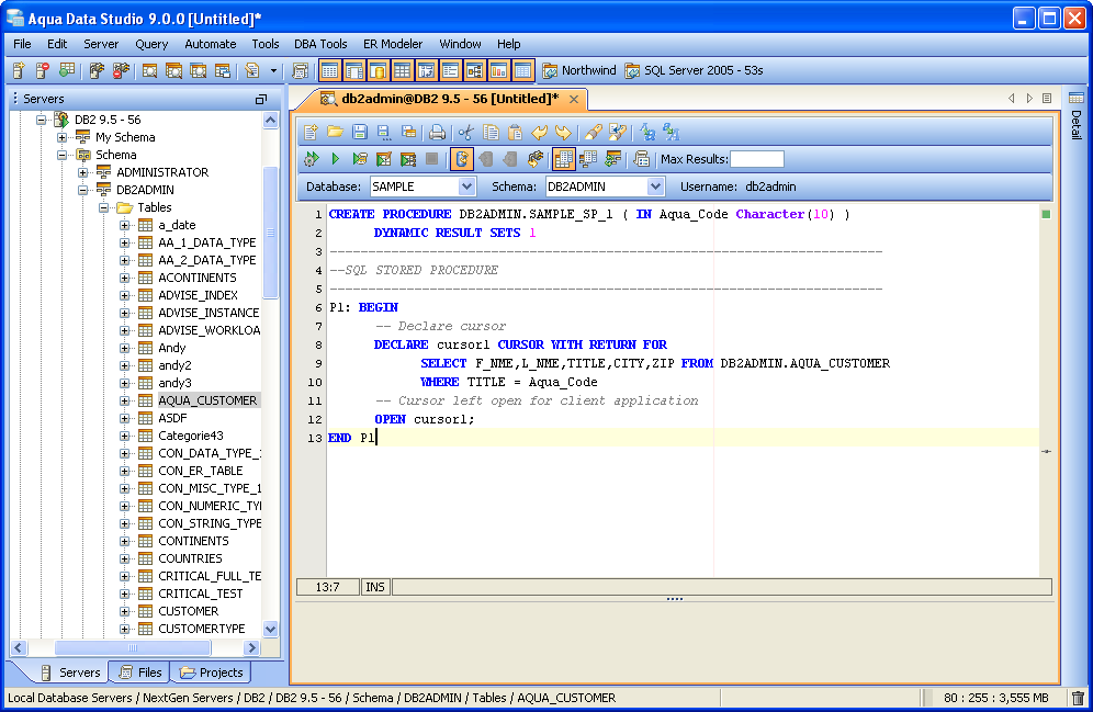 SAMPLE DB2 UDB STORED PROCEDURE This stored procedure, when executed, will return all rows from the table DB2ADMIN.AQUA_CUSTOMER based on the condition that Aqua_Code parameter is equal to the specified TITLE column in the table. For example, if it's desired for the stored procedure to return all rows from the table with TITLE=CTO, specify the input parameter AQUA_CODE as 'CTO'. If it's all the Managers which are needed, just specify input parameter AQUA_CODE as 'MANAGER'. A cursor is declared which loops through each row in the Table.