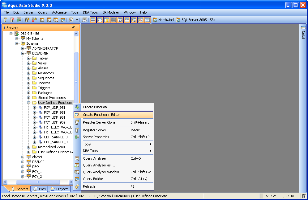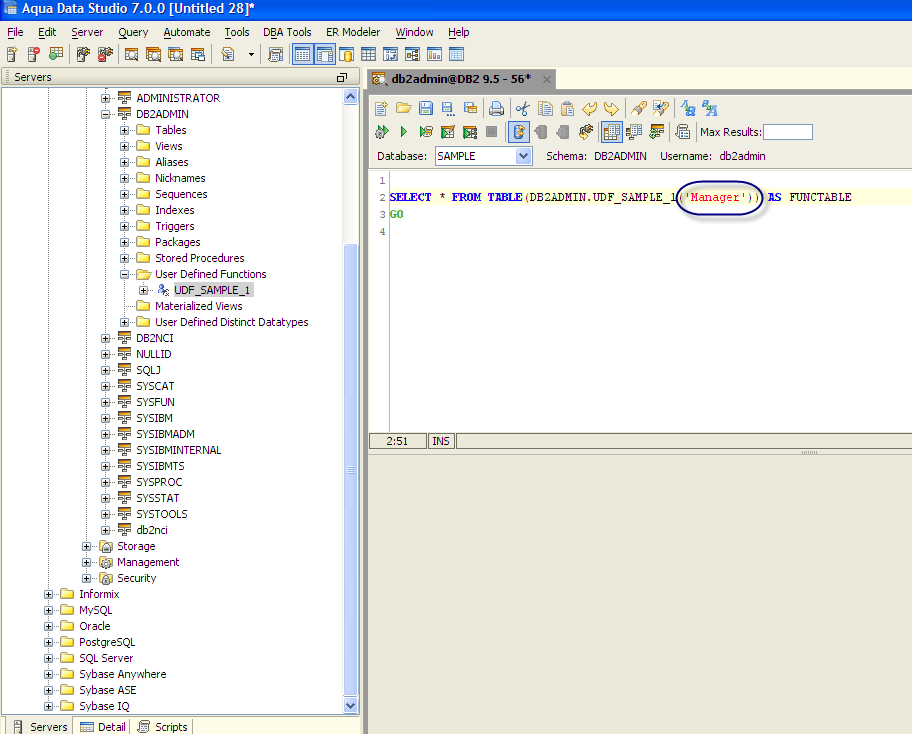 Executing DB2 USER DEFINED FUNCTION Connect to the Database Server and Open a Query Analyzer. Type the following and Execute to see the UDF result