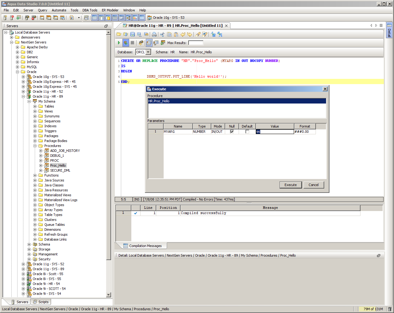 Procedure Editor When a Procedure has been opened with the Procedure Editor, the button normally associated with Executing a statement becomes associated with compiling. To the right of it is a similar button with a gear behind it for executing the procedure. Compile - Compiles the procedure, logs any compilation messages in the result grid below it. To jump to the source of a compilation error, double-click on the line in the Compilation Messages grid. Options for determining if both the header and the body are both compiled when compile is executed can be set in File -> Options -> Procedure Editor. Execute Procedure - Displays the Execute Procedure dialog to let the user specify parameters before execution. To set a value, simply click on the parameter’s Value cell and enter a value. To execute, click the Execute button or click the Cancel button to abort execution. When Packages, Functions or Procedures are Invalid, a red invalid indicator appears in the Schema Browser tree over the object's icon.