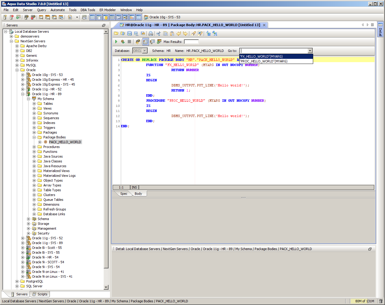 Package Editor Compile - Compiles the package, logs any compilation messages in the result grid below. To jump to the source of a compilation error, double-click on the line in the Compilation Messages grid. Options for determining if both the header and the body are both compiled when compile is executed can be set in File -> Options -> Procedure Editor. Execute Procedure - Displays the Execute Procedure dialog to let the user specify parameters before execution. To set a value, simply click on the parameter’s Value cell and enter a value. To execute, click the Execute button or click the Cancel button to abort execution. The Oracle Package Editor allows users to edit packages more easily by providing both the definition (specification) and the body in one tab window. The editor also provides a drop down of all functions & procedures in the package for quick navigation. When Packages, Functions or Procedures are Invalid, a red invalid indicator appears in the Schema Browser tree over the object's icon.