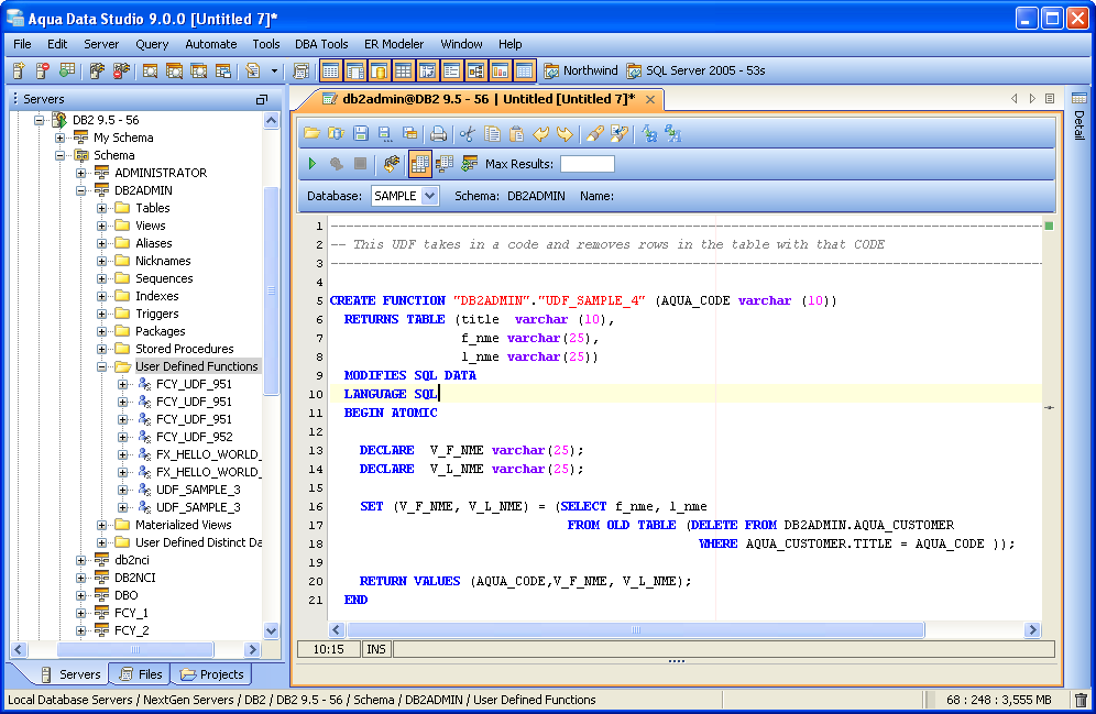 SAMPLE DB2 USER DEFINED FUNCTION This User Defined Function when executed will delete row from the table DB2ADMIN.AQUA_CUSTOMER based on the input parameter Aqua_Code. This parameter is matched to the specified TITLE column in the table. For example, if you want the UDF to delete rows from the table with TITLE=Manager, you need to specify the input parameter AQUA_CODE as 'Manager'.