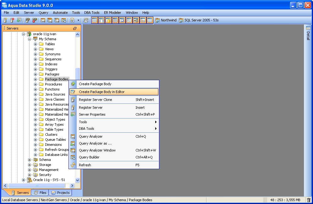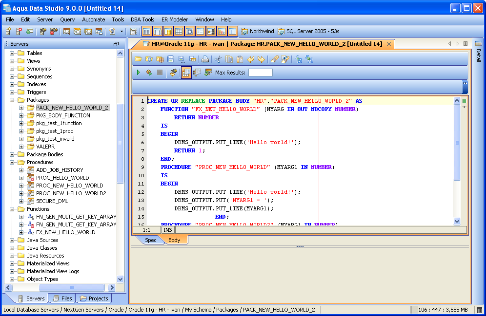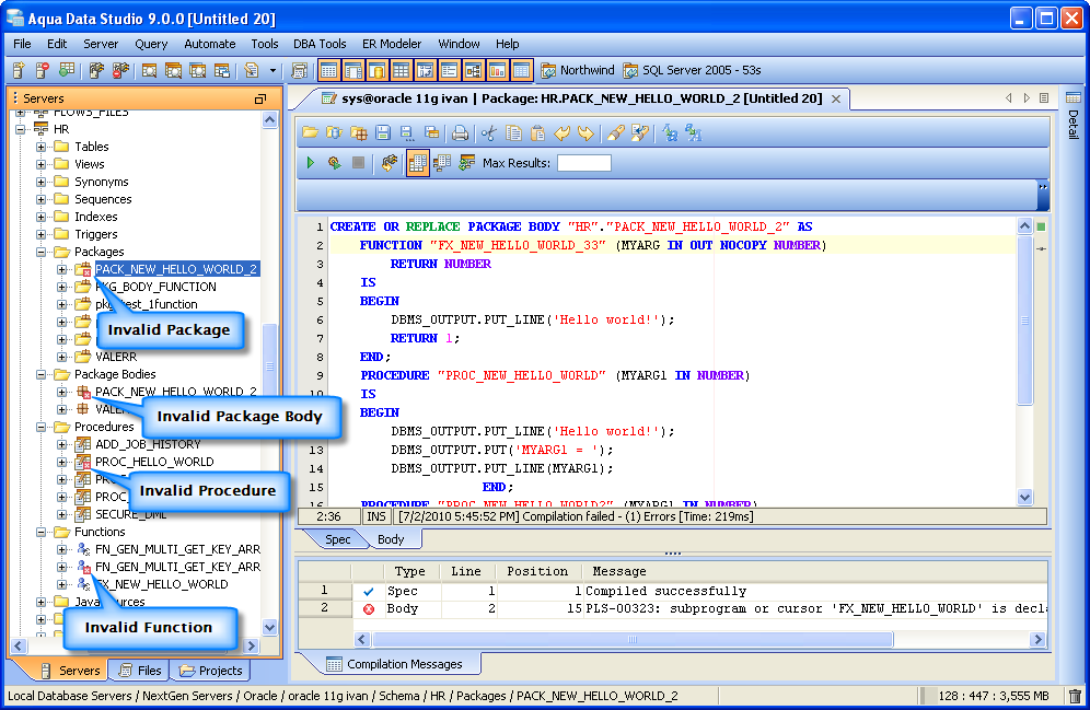 Aqua Data Studio can access and edit Procedures, Functions and Packages through the Schema Browser. Stored Procedures are subroutines stored in a database's dictionary and are often used for data validation and access control. They collect logic usually spread across several statements in complex actions for access from a single call. Functions are blocks of code to perform a series of actions used to extend the functionality of a database server. User defined functions are defined with CREATE FUNCTION in SQL statements. They can be used for converting and evaluating data or performing other actions. Packages, in Oracle, are used for encapsulating a group of functions, procedures and other program objects. Packages have specifications (definitions) and bodies. They provide containers for related items. Depending on the database version and vendor, Package, Procedure and Function debugging is also available. See the SQL Debuggers section for more. When Procedures, Functions and Packages are invalid, they are marked in the Schema Browser with a red box icon overlay. Expanding marked objects in the Schema Tree shows which specific Package contents are invalid. Options for determining if both the header and the body are both compiled when compile is executed can be set in File -> Options -> Procedure Editor.