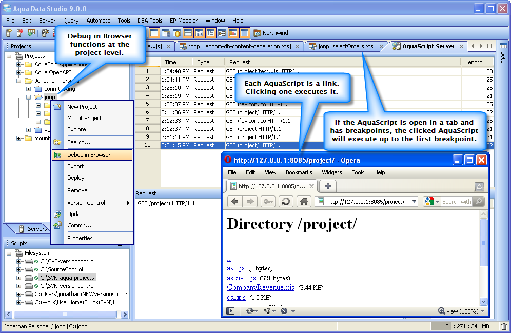 Execute Scripts in the Editor: With the AquaScript editor, you are able to execute an AquaScript in 3 different modes from the editor toolbar. The 3 modes include: Execute in console, Debug in Console and Debug in Browser. The Execute in Console allows the user to execute the script with the Console window as the primary out to the user. Debug in Console allows the user to debug a script executed in Console mode. The Debug in Browser will launch a basic webserver within Aqua Data Studio and allow a browser to request the execution of the script, in which case the script may output to the console or to the aqua.response object which will be sent to the browser for HTML rendering. The latter is to allow a user to write and debug scripts that will be deployed to Aqua Data Server as a web-based script or application.
