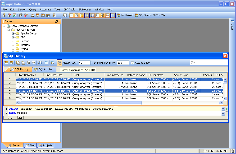 Launching the Copy History Compare Tool The Copy Compare Tool provides users a method of depicting differences in the content of the clipboard history. To compare two items copied to the clipboard history, launch the Copy Compare Tool from Tools Menu (Tools->Compare->Copy Compare) and choose two items out of the list in the top panel. The lower panel displays the full contents of the selected item from the copy clipboard. It is possible to launch the Copy History Compare Tool from within the SQL History and SQL Archive tool. This allows comparison of the contents of queries stored in the SQL History and SQL Archive. Select two items with CTRL + click enables the comparison with the button to the left of the "Max History". When the comparison is being performed it runs in a background thread so that other operations in Aqua Data Studio can be performed. Comparison Results The results of a comparison display as a split-pane with line numbering down the center and connecting splines for identifying where the deletions, changes and additions occur. Each clipboard history item in a comparison takes up half of the comparison results window and each can be vertically scrolled independently of the other. At the top, between the two clipboard history items above the line numbering, digits separated by a / indicate the change selected out of total number of changes discovered (i.e. 9/27). The large up and down arrows at the top of the comparison results allow navigating through the differences one at a time. Comparisons show the character differences in a modified line with bolding and background color highlights indicate modified blocks. If they are not identical they are highlighted by default in pink (deleted), purple (changed) or green (added). The colors for the difference highlighting can be changed with the Options button at the top right of the comparison results. At the top left of the comparison results is a search button, useful for quickly finding and highlighting content in the comparison results. Annotation Bar The annotation bar provides a bird's eye view of all of the differences detected in a comparison. When differences are found, their corresponding highlight colors appear in the annotation bar on the right side of the results and can be used to quickly navigate to them. If a marker in the annotation bar is used to navigate to a particular difference by left clicking, a tick mark overlay shows which difference currently has focus. Saving Comparison Results as HTML The results of a comparison can be saved as HTML for viewing later or for sharing with others. The "Save As HTML" button at the top left of the comparison window prompts for file destination and font selection. If the "Preview in Browser" icon is clicked the user is prompted to first "Save as HTML" for launching a web browser. If the comparison has already been saved as HTML, clicking "Preview in Browser" launches a browser with the stored HTML. |