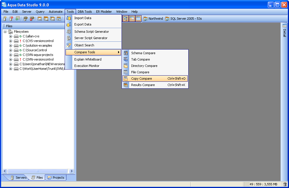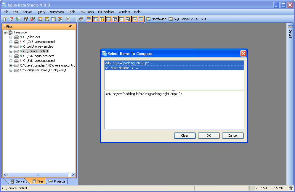 Launching the Copy History Compare Tool The Copy Compare Tool provides users a method of depicting differences in the content of the clipboard history. To compare two items copied to the clipboard history, launch the Copy Compare Tool from Tools Menu (Tools->Compare->Copy Compare) and choose two items out of the list in the top panel. The lower panel displays the full contents of the selected item from the copy clipboard. It is possible to launch the Copy History Compare Tool from within the SQL History and SQL Archive tool. This allows comparison of the contents of queries stored in the SQL History and SQL Archive. Select two items with CTRL + click enables the comparison with the button to the left of the "Max History". When the comparison is being performed it runs in a background thread so that other operations in Aqua Data Studio can be performed. Comparison Results The results of a comparison display as a split-pane with line numbering down the center and connecting splines for identifying where the deletions, changes and additions occur. Each clipboard history item in a comparison takes up half of the comparison results window and each can be vertically scrolled independently of the other. At the top, between the two clipboard history items above the line numbering, digits separated by a / indicate the change selected out of total number of changes discovered (i.e. 9/27). The large up and down arrows at the top of the comparison results allow navigating through the differences one at a time. Comparisons show the character differences in a modified line with bolding and background color highlights indicate modified blocks. If they are not identical they are highlighted by default in pink (deleted), purple (changed) or green (added). The colors for the difference highlighting can be changed with the Options button at the top right of the comparison results. At the top left of the comparison results is a search button, useful for quickly finding and highlighting content in the comparison results. Annotation Bar The annotation bar provides a bird's eye view of all of the differences detected in a comparison. When differences are found, their corresponding highlight colors appear in the annotation bar on the right side of the results and can be used to quickly navigate to them. If a marker in the annotation bar is used to navigate to a particular difference by left clicking, a tick mark overlay shows which difference currently has focus. Saving Comparison Results as HTML The results of a comparison can be saved as HTML for viewing later or for sharing with others. The "Save As HTML" button at the top left of the comparison window prompts for file destination and font selection. If the "Preview in Browser" icon is clicked the user is prompted to first "Save as HTML" for launching a web browser. If the comparison has already been saved as HTML, clicking "Preview in Browser" launches a browser with the stored HTML. |