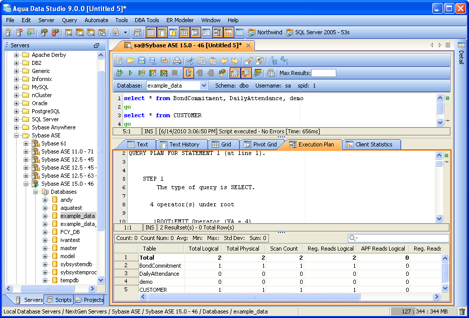 Explain Plan for Sybase 12.5 and 15.x TEXT Explain The TEXT Explain option displays a text formatted version of the explain plan, with an associated Explain grid underneath it. There are columns within the grid for Total Logical Reads, Total Physical Reads, Scan Count, Regular Reads Logical, APF Reads Logical, Regular Reads Physical, APF Reads Physical and APF IOs. XML Explain With the XML Explain option selected, the Explain Plan displays a diagram which allows clicking nodes to view details for those nodes in the Details tab. Mouse hover over nodes also produces a tool-tip containing statistics for that node. The Details tab displays information about the currently selected node in the Diagram, including information on