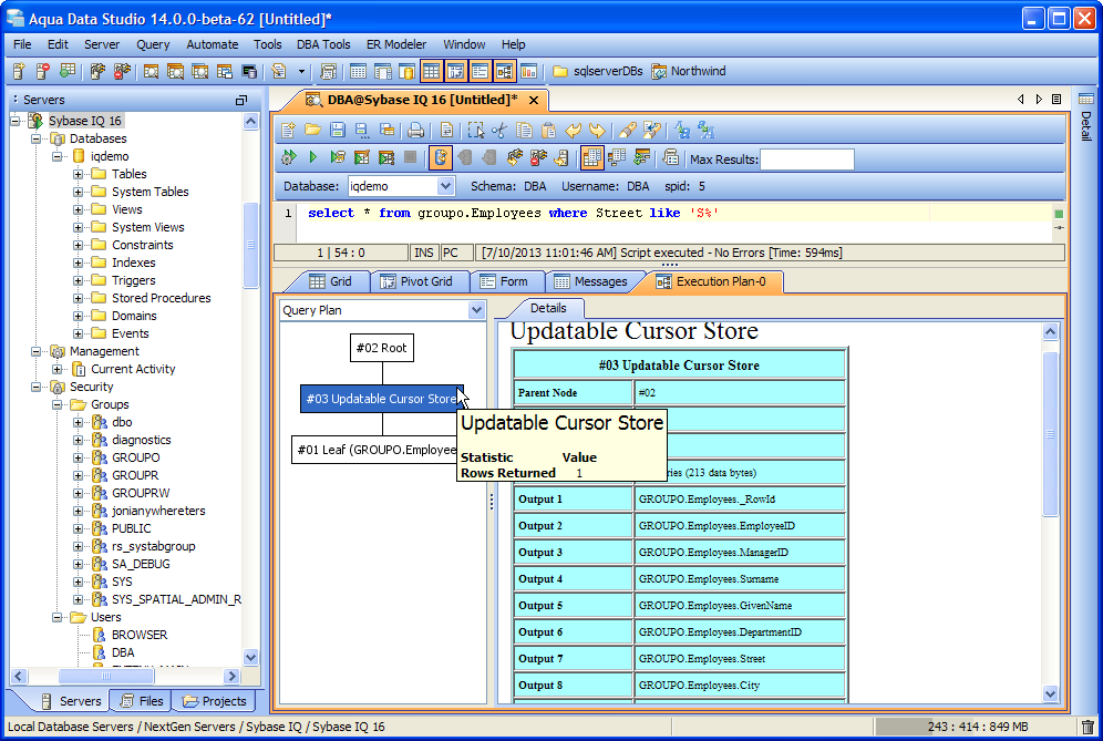 Execution Plan for Sybase IQ 15.x and Sybase IQ 16.0 When executing a query it is possible to view Execution Plans for Sybase IQ 15.x and Sybase IQ 16.0. Once the query executes and the Execution Plan Results Tab is viewed, there are three possibilities for viewing: