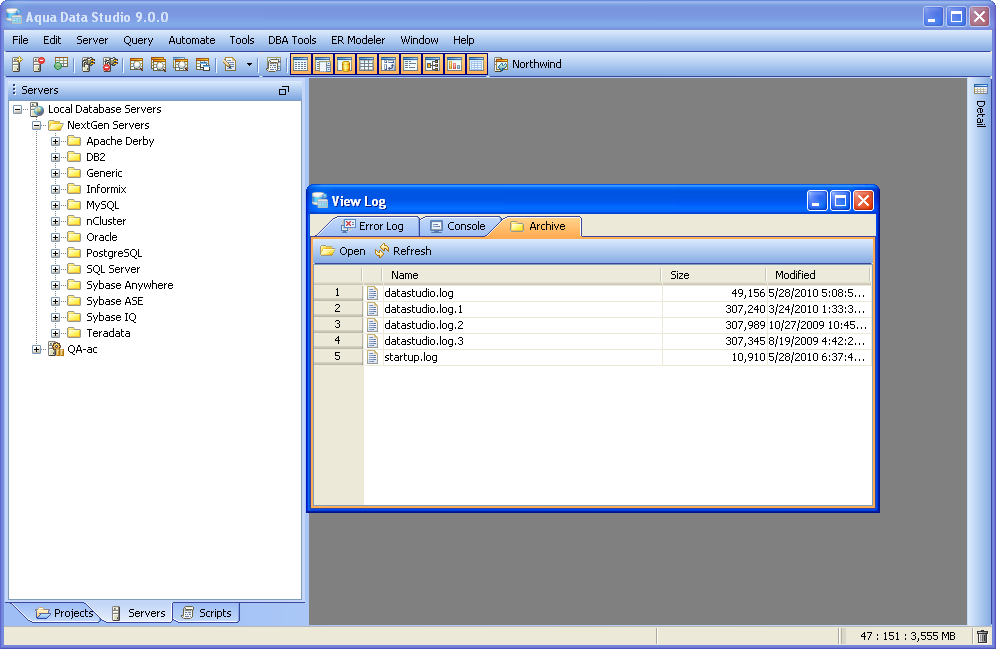 The View Log window provides three tabs for examining logs, errors and actions taken by Aqua Data Studio. This is useful for troubleshooting issues and support questions, and monitoring server connection status. The Logs and Support information can be found under the main application menu item Help