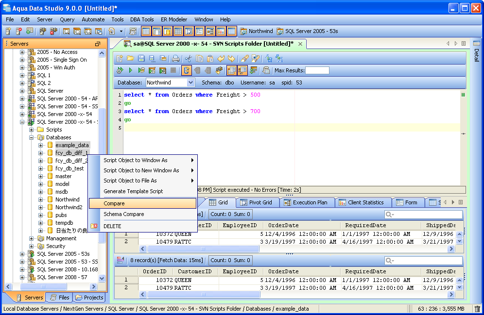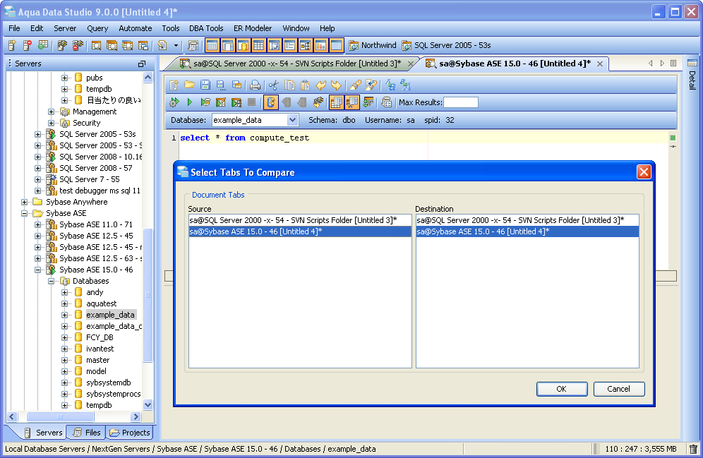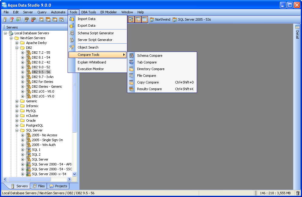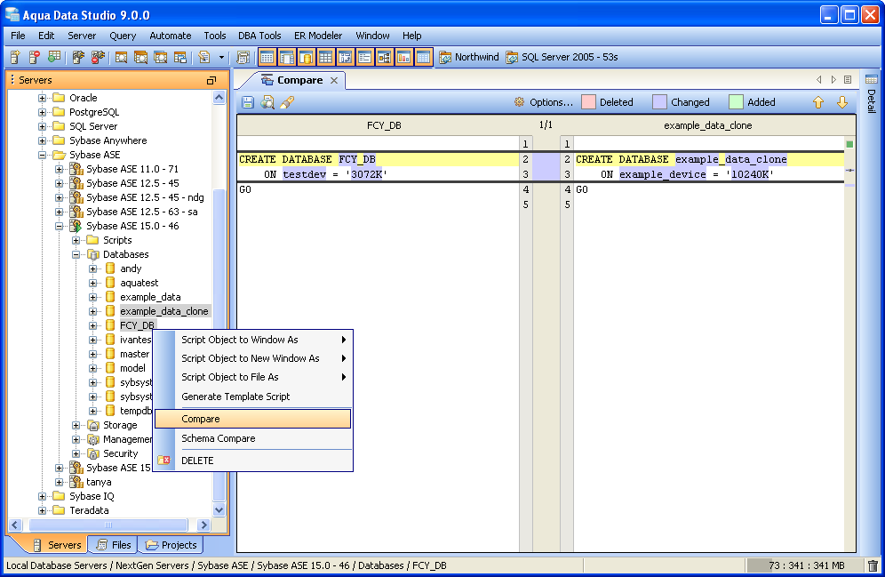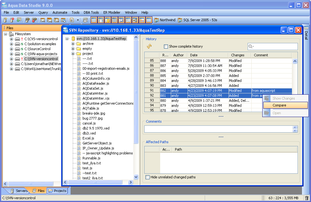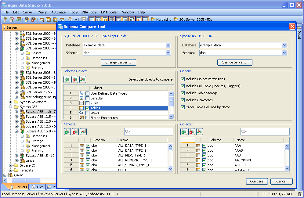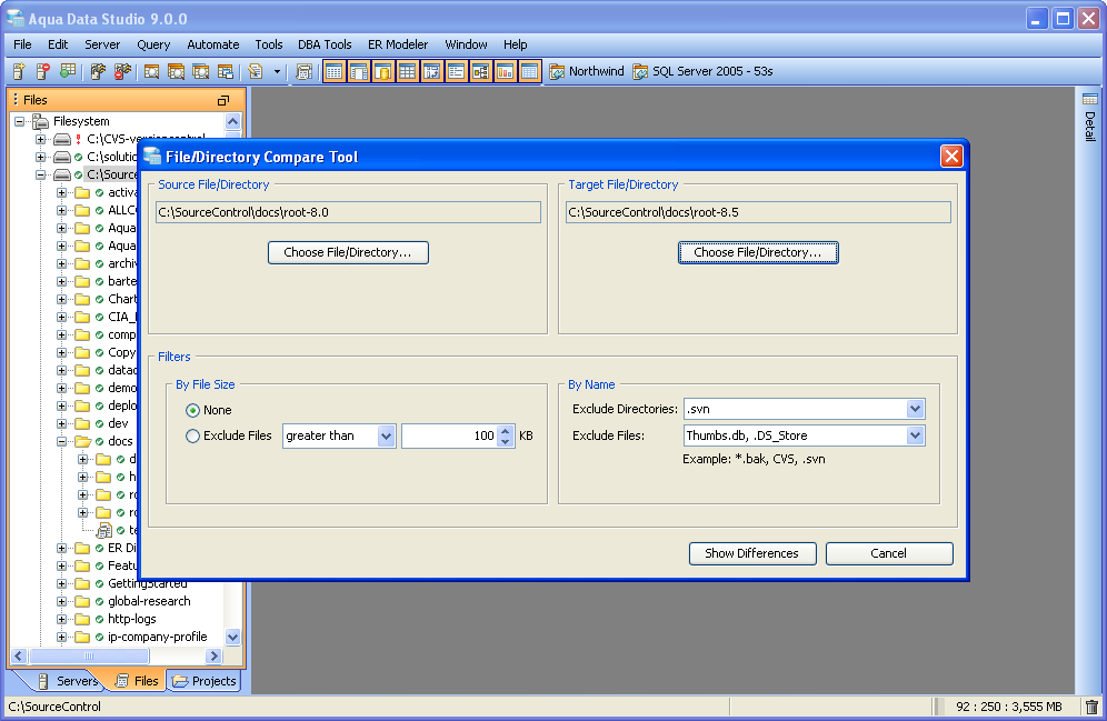 Compare Tools Integration Aqua Data Studio provides Compare Tools for users to easily compare database schemas, schema objects, queries, query results, files, directories, clipboard contents and version control histories. To access the Compare Tools directly, you may use the Application menu under Tools->Compare Tools->[Tool]. Compare tools are also thoroughly intigrated within Aqua Data Studio. When a document that is part of version control is open, and inline compare tools have been enabled (File->Options->Editors->Editor->General:[Inline Diff Sidebar]), the left margin of the document highlights differences between the working version and the repository version. This allows live comparisons with the local source control repository to be run as editing continues. Files viewed within the Repository Browser can also be compared with their previous versions. Depending on the context, the application also makes compare tools available on a per-menu or per tab basis. Selecting two items within the Schema Browser or Files Browser with Ctrl + Click and right clicking allows the selection of Compare from the right click menu. When multiple document tabs are open, right clicking on one of them allows comparing the contents of the documents or query windows. The Copy History Compare Tool allows comparing the contents of the clipboard history. Comparing two Schema Objects is only performed through Ctrl + Click (or Alt + Down Arrow) of two selected items from the Schema Browser. Colored background highlighting and font bolding are used to indicate differences within comparison results. Depending on the comparison type, icons also indicate the presence and absence of content. The coloring Aqua Data Studio uses to indicate Deleted, Changed or Added when displaying compare results is configurable within File->Options->Compare->Colors. Comparison Tuning and Filtering Depending on the type of comparison run (file, schema, results, tab) various comparison filters and options are available. When files, queries or tabs are compared, the comparison functions down to the character level within each. When Database Schemas are compared, the level of comparison granularity can be set by the user for database schema object types as desired. File and Directory comparisons allow selecting for wildcards, file size and file extension allowing for exclusion of .svn, CVS, .DS_Store, Thumbs.db, .bak and other file types. For even more control over the comparison, filters can be run once the comparison is completed. The presented comparison results can then be sorted by columns displayed in the comparison. The results of all comparisons (except the inline-diff within editors) can be saved as HTML for storage or sharing. The Six Compare Tools When accessed through the Tools menu, there are 6 comparison tools available: