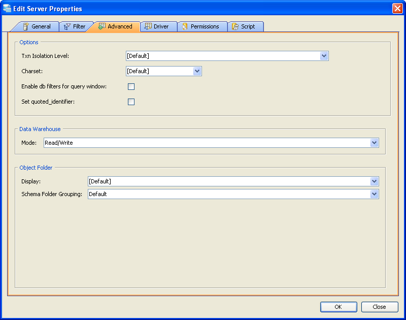 Edit the Server Properties, to use FILTER options for a Server in Aqua Data Studio: