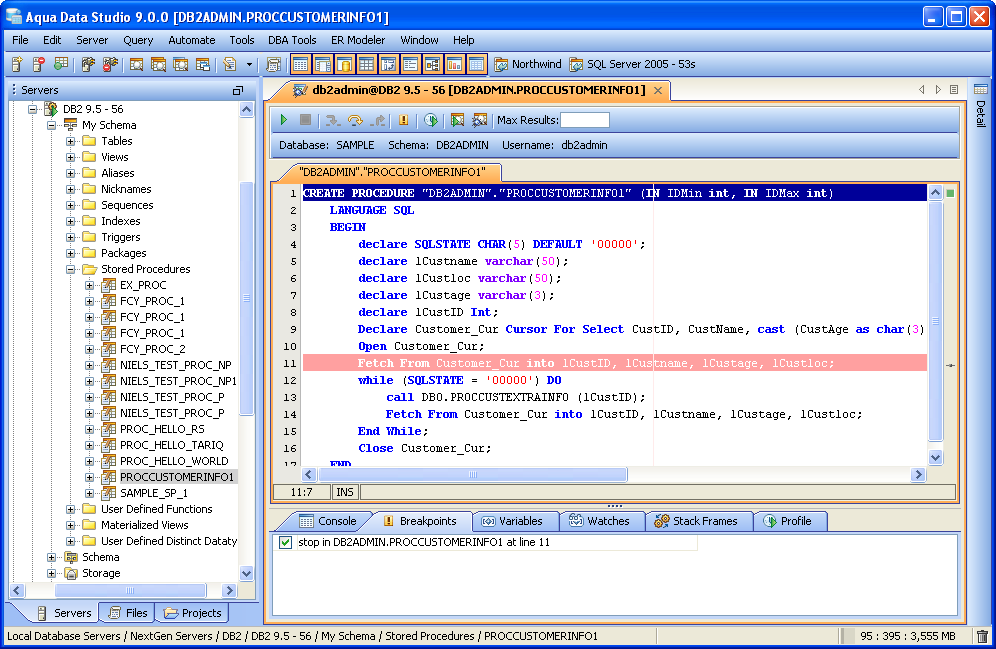 Aqua Data Studio's integrated PL/SQL Debuggers allow single-stepping, pausing, and breakpointing packages, procedures and functions to assist in troubleshooting complex queries and statements. Debuggers exist for those database vendors and versions which have application programming interfaces (APIs) to allow them. Sybase SQL Debugger The Sybase SQL Debugger has been designed to help with testing and debugging of SQL functions and procedures for Sybase ASE versions 12.5 and above. Oracle SQL Debugger The Oracle SQL Debugger has been designed to help with testing and debugging of SQL packages, functions and procedures for Oracle versions 9i and above. MS SQL Server Debugger The MS SQL Server Debugger has been designed to help with testing and debugging of SQL functions and procedures for MS SQL Server 2005 and above. The Microsoft SQL Server Debugger requires that specific connection settings configurations be made for the debugger to work appropriately. Check the Registering MS SQL Connections for Debugging section for more information. DB2 SQL Debugger The DB2 SQL Debugger has been designed to help with testing and debugging of SQL stored procedures for DB2 versions 9.0 and above. |