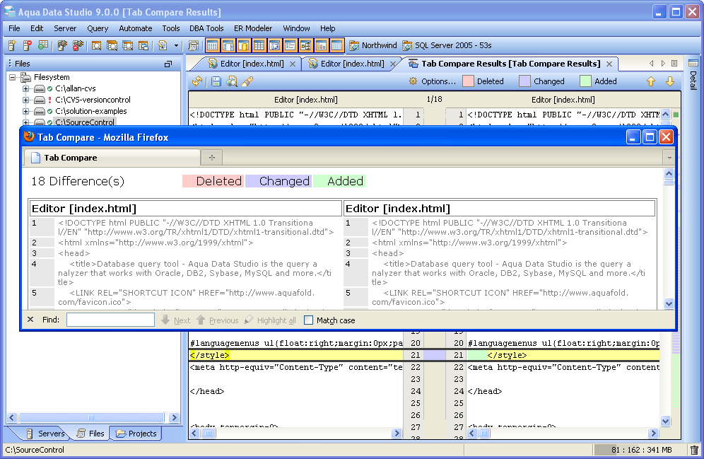 Launching the Tab Compare Tool The Tab Compare Tool provides users a method of depicting differences in the content of application tabs. To compare two application tabs, either right click in one of several open tabs, or launch the Tab Compare Tool from Tools Menu (Tools->Compare->Tab Compare) and choose two tabs out of the list of tabs. If the Tab Compare Tool is launched from the Tools Menu, it is possible to choose tabs that are not immediately visible in the application window, but are open. When the comparison is being performed it runs in a background thread so that other operations in Aqua Data Studio can be performed. Comparison Results The results of a comparison display as a split-pane with line numbering down the center and connecting splines for identifying where the deletions, changes and additions occur. Each tab in a comparison takes up half of the comparison results window and each can be vertically scrolled independently of the other. At the top, between the two tabs above the line numbering, digits separated by a / indicate the difference selected out of total number of differences discovered (i.e. 9/27). The large up and down arrows at the top right of the comparison results allow navigating through the differences one at a time. Comparisons show the character differences in a modified line with bolding and background color highlights indicate modified blocks. A refresh compare button allows running the comparison again, if edits have been made in either tab. To right of the refresh button, save button and preview results as html button is a search button (a flashlight icon), useful for quickly finding and highlighting content in the comparison results. Annotation Bar The annotation bar provides a bird's eye view of all of the differences detected in a comparison. When differences are found, their corresponding highlight colors appear in the annotation bar on the right side of the results and can be used to quickly navigate to them. If a marker in the annotation bar is used to navigate to a particular difference by left clicking, a tick mark overlay shows which difference currently has focus. Saving Comparison Results as HTML The results of a comparison can be saved as HTML for viewing later or for sharing with others. The "Save As HTML" button at the top left of the comparison window prompts for file destination and font selection. If the "Preview in Browser" icon is clicked the user is prompted to first "Save as HTML" for launching a web browser. If the comparison has already been saved as HTML, clicking "Preview in Browser" launches a browser with the stored HTML. |