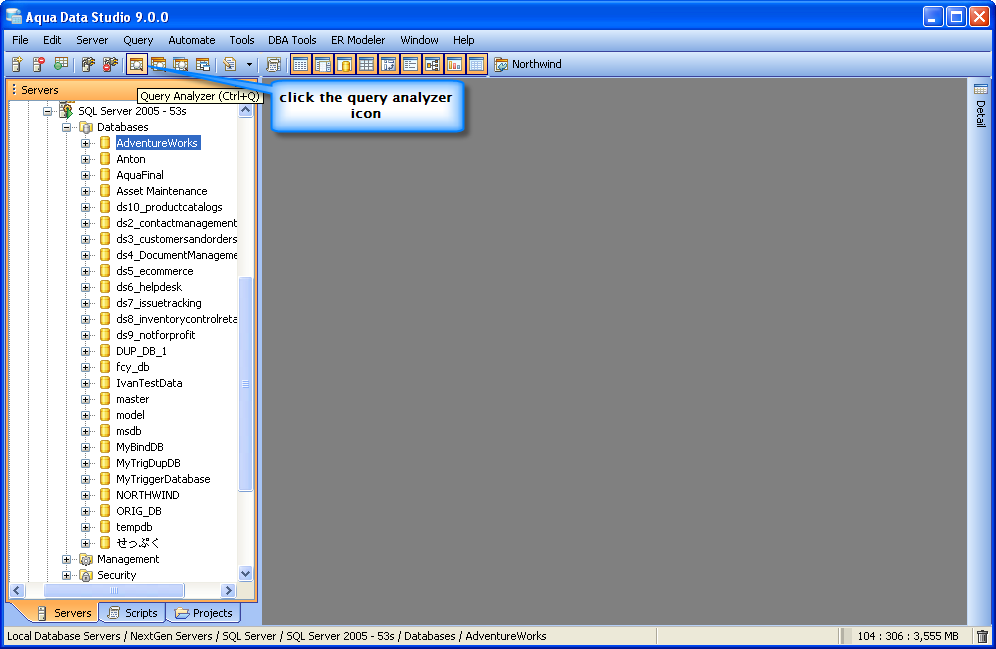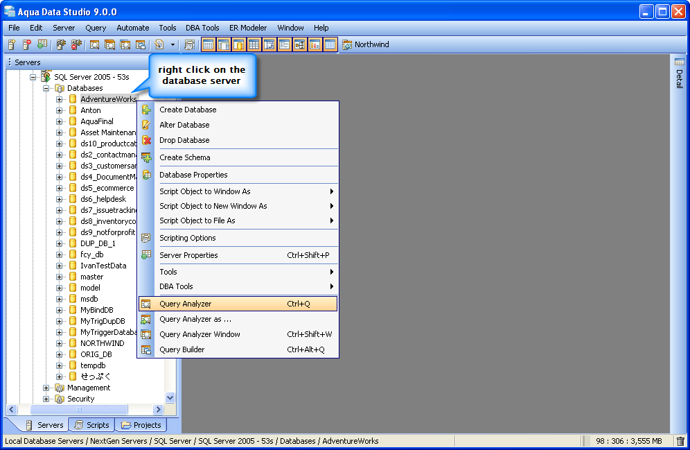 After Registering a Server in Aqua Data Studio the Query Analyzer can be launched to execute and edit SQL. There are different methods of invoking the tool, all of which launch the Query Analyzer. It is best to navigate to the server and left click to select it in the Schema Browser first, to ensure the apporpriate database is being used before beginning.