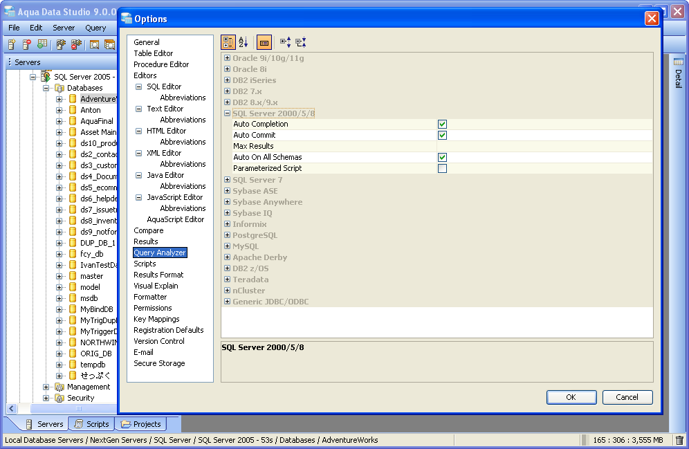 All of the above operations launch the Query Analyzer Tool, which lets you execute SQL Queries in the Database Server you are connected to. Within the Query Analyzer is a dropdown for picking other databases on the currently connected server. Multiple Query Analyzers can be open at the same time in tabs or within additional free floating Query Analyzer Windows. Editing Properties of a Query Analyzer in Aqua Data Studio The properties of the Query Analyzer can be viewed and altered by selecting File->Options->Query Analyzer from the main menu . There are defaults set for the Query Analyzer in the Options Dialog, depending on the database vendor and version chosen. The preset defaults for each vendor and version have been selected based on previous user experience and supporting database documentation.