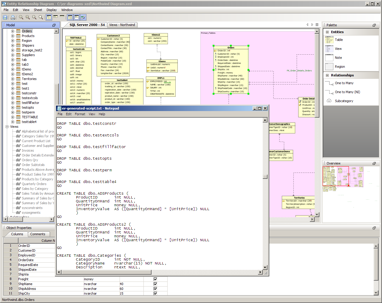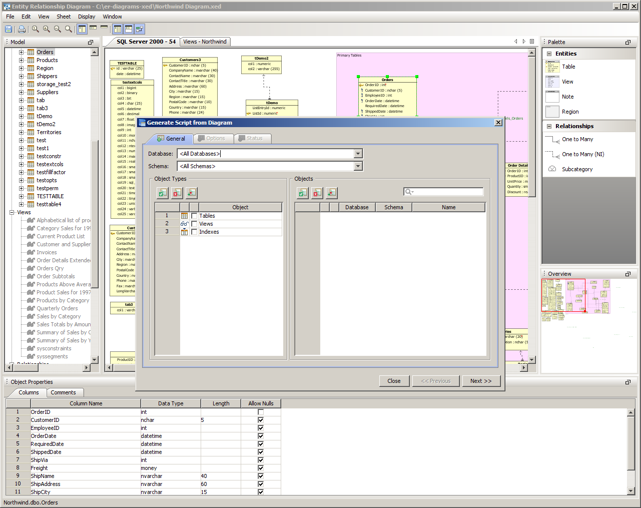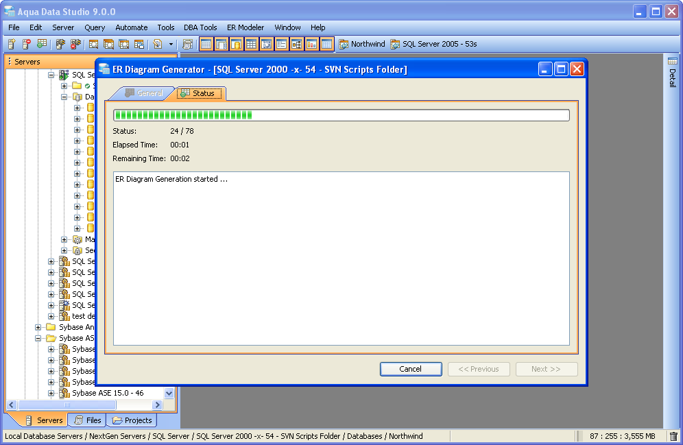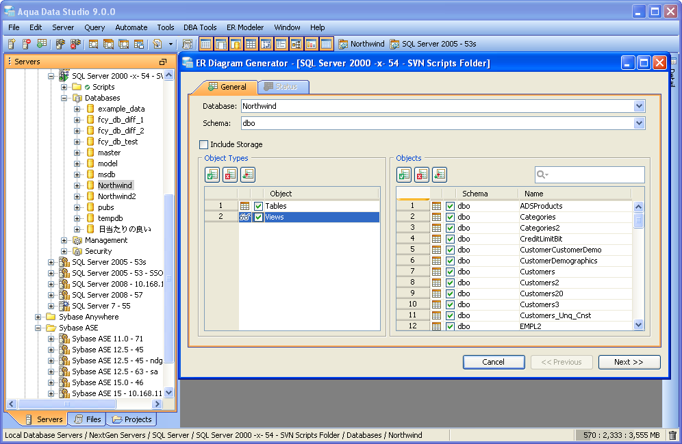 Generate ER Diagram (Schema Browser) From within Aqua Data Studio's Schema Browser 1. Right click on the desired database or schema object and select Tools->Generate ER Diagram (or choose Tools->Generate ER Diagram from the Main Application Menu and select the database server and database). 2. Choose the object types and objects to be generated in the ER diagram. Select what schema, and schema objects are to be generated in the diagram. Use the quickfilter to focus a search to key words or wildcards. Individual Object Types (Tables, Views) and individual Objects can be selected. Table Storage can be included in the diagram. Click next. 3. View the progress of the ER Diagram generation. 4. The objects selected for ER Diagram generation display in the ER Modeler as entities in a new, unnamed diagram. |