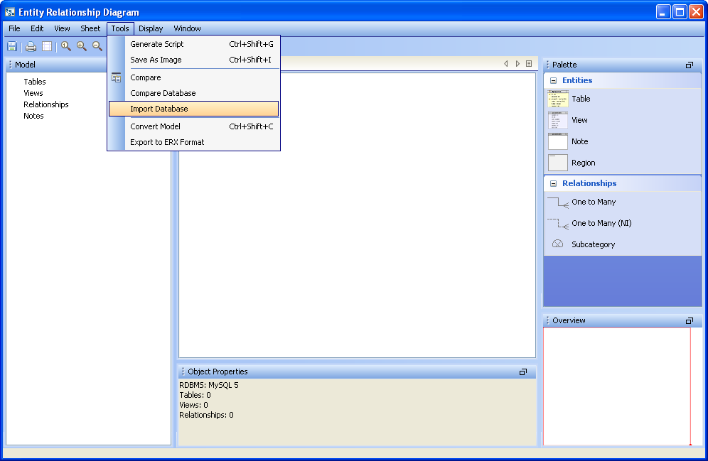 You can generate an ER Modeler from databases and schema objects, allowing conversion of database commands into diagrams. There are two methods of Reverse Engineering within Aqua Data Studio, importing a database within the ER Modeler and generating an ER diagram through the Schema Browser. Importing a database is accomplished through the ER Modeler Menu Bar under Tools->Import Database. Within the Main Application Menu of Aqua Data Studio, Tools->Generate ER Diagram can be used for Reverse Engineering. An object in the Schema Browser can also be right clicked for Tools->Generate ER Diagram. Import Database Before a database can be imported, an existing ER Diagram must exist with the database vendor and version chosen. 1. Select Tools->Import Database from the Menu Bar. 2. Select the database server from the connections list 3. Select what database, schema, and schema objects to be imported to the diagram. Use the quickfilter to focus a search to key words or wildcards. Individual Object Types (Tables, Views) and individual Objects can be selected. Table Storage can be included in the import. Click next. 4. View the progress of the import. 5. The objects selected for import display in the current ER Model as entities.