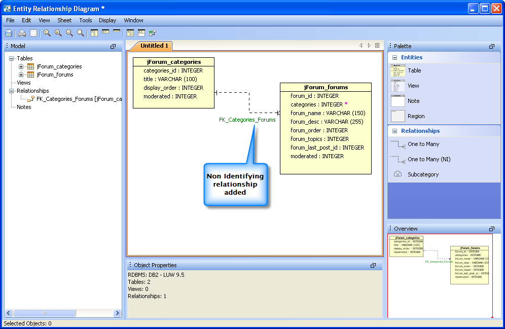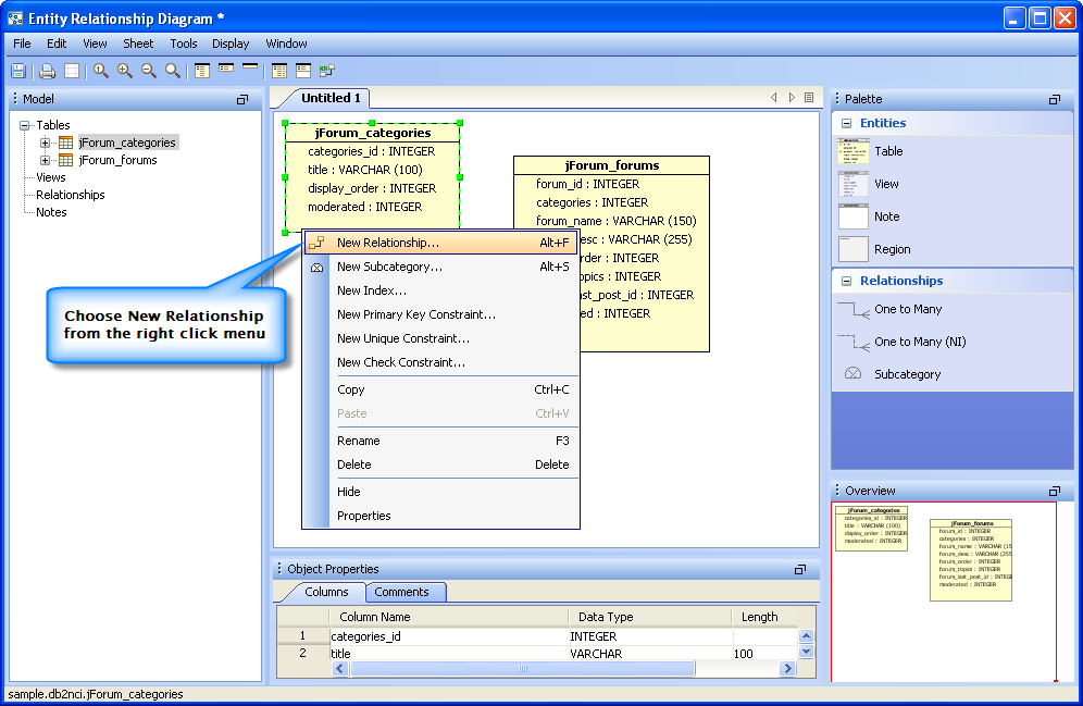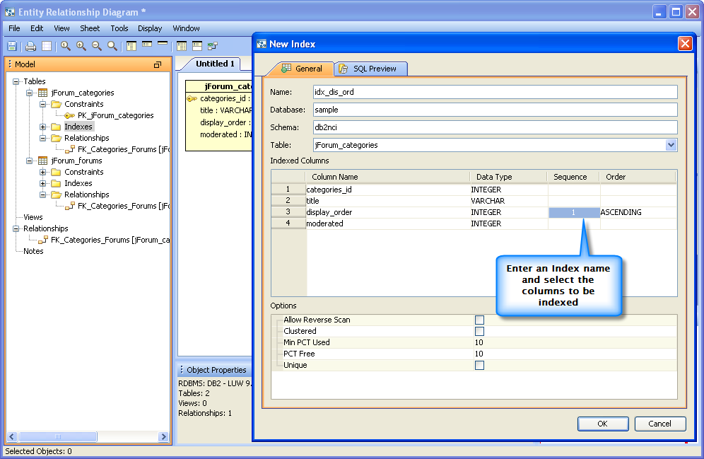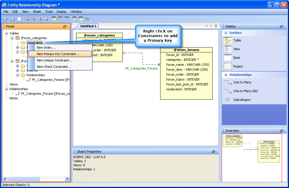 Below is a step by step demonstration of an ER Model being created with tables, relationships, constraints and indexes. The model is then used to generate the DDL for importing into a database.