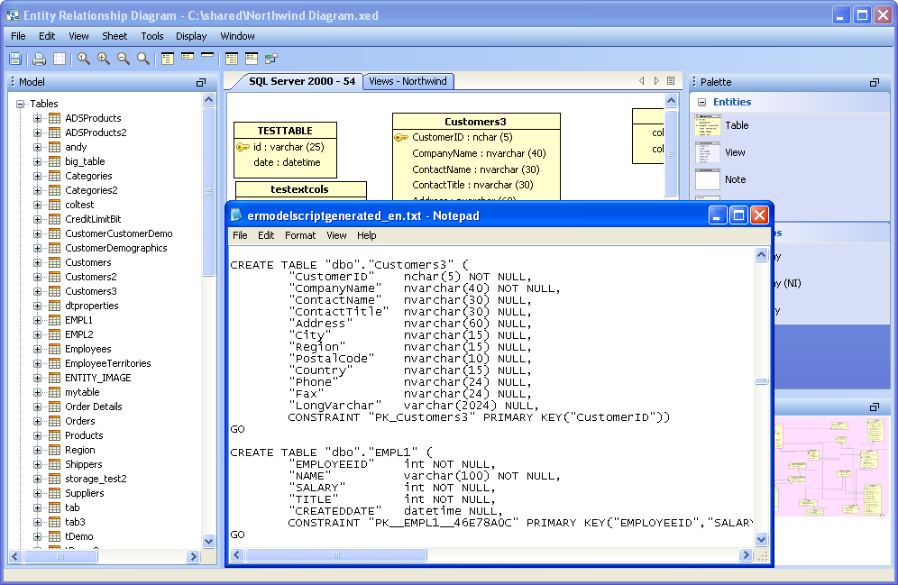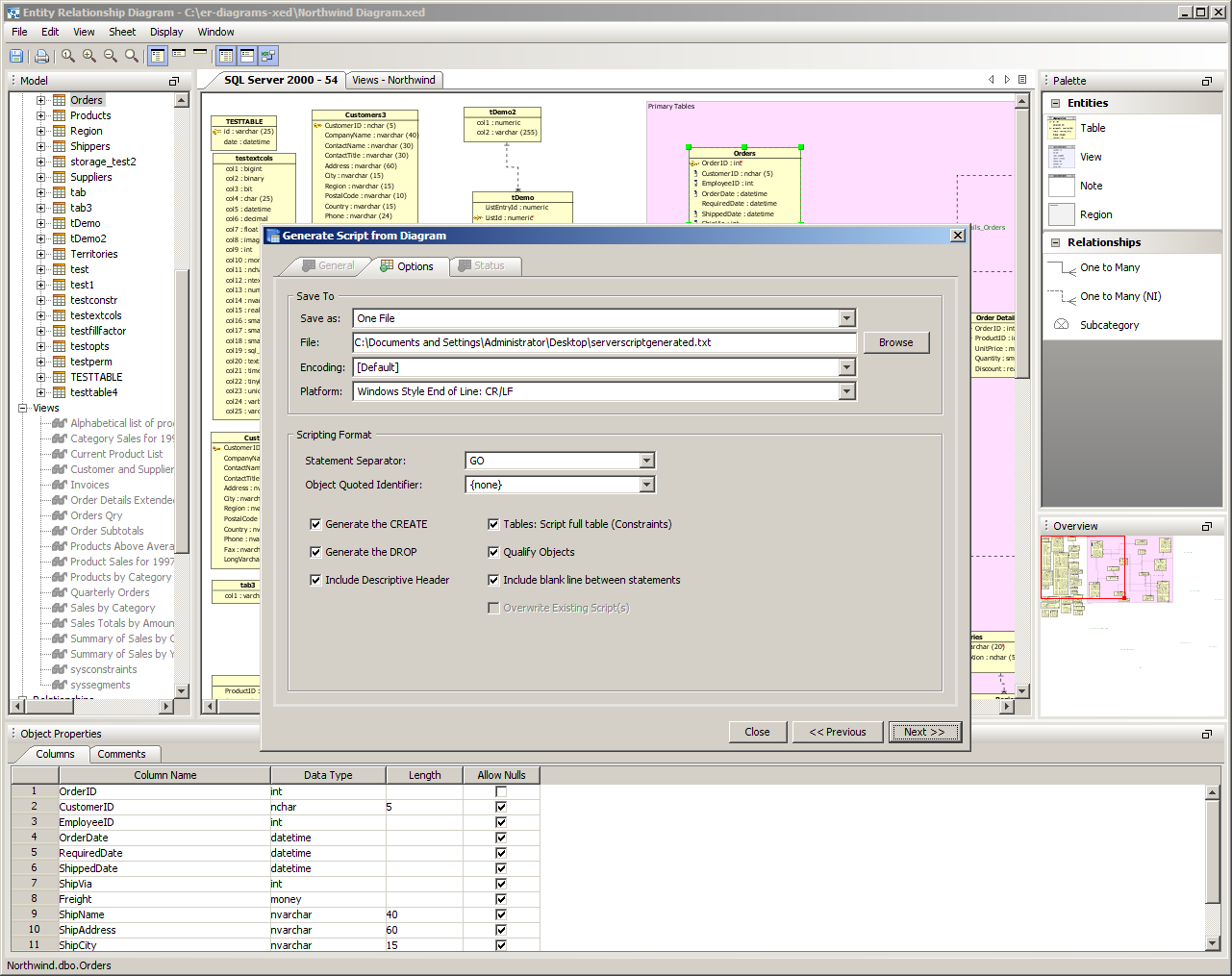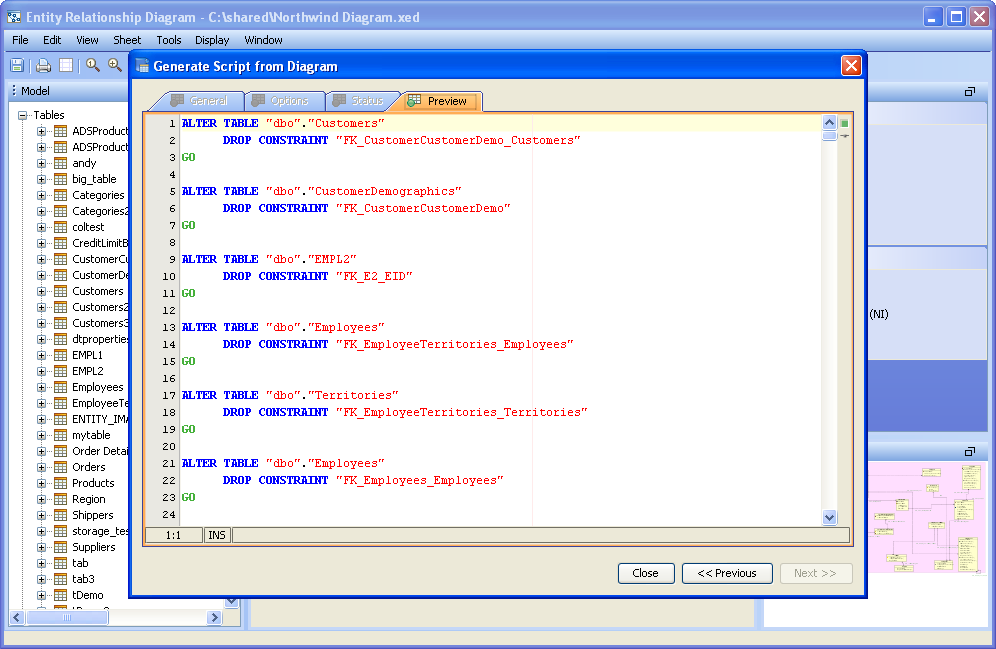 Scripts can be generated from the content of the ER Modeler (Forward Engineering), allowing conversion of the diagram into database commands and DDL. The resulting DDL can be imported via Aqua Data Studio's import command into another database, or saved and shared as an SQL script. Generating Scripts from an ER Model works nearly the same as generating a script through right click on an object in the Schema Browser, and selecting "Schema Script Generator." Generating a Script from an ER Model 1. Select "Generate Script" from the Tools Menu in the Menu Bar, or use the keyboard shortcut CTRL + SHIFT + G. 2. Select what database, schema, and schema objects are to be generated from the diagram. Use the quickfilter to focus a search to key words or wildcards. Individual Object Types ( Tables, Views and Indexes) and individual Objects can be selected. Click next. 3. Modify the Options for the script. Save as a single file, one file per object, or choose to preview the script without generating any files. Choose the script location, encoding, platform, statement separator, object quoted identifier, CREATE generation, DROP generation, Include Descriptive Header, Include Blank Line Between Statements, Include Comments, Qualify Objects, and other options. Click next. 4. View its status for errors and elapsed time as the script is being generated. If the script generated successfully without errors, click close and browse through the operating system to the destination directory selected above to find the file. If "Preview" was selected in the "Save As" option, the Preview tab will open containing the resulting script with syntax highlighting as set under File->Options->Editors->SQL Editor The generated script contains all of the database commands needed to generate the diagram within a database.