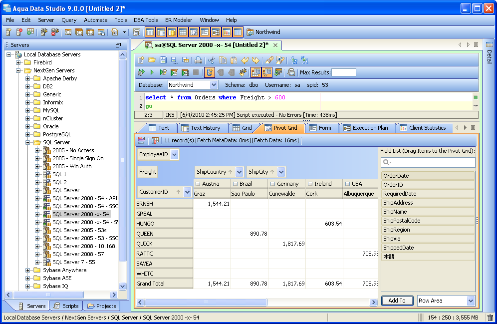 Pivot Grid Results - The Pivot Grid presents the results as a set of user-configurable tables with data sorting, the equivalent of a Pivot Table in Microsoft Excel. One pivot grid is displayed per result set. The Pivot Grid Results offer an expansive set of features, including scriptable charts and the ability to save to Excel spreadsheets with charting. Read more on Aqua Data Studio's Pivot Grid Charts here. They are particulary useful with large amounts of data, helping a user to classify data by categories and obtaining summaries without the time consuming search that it would normally take to look through all of the data. Pivot grids, once configured, can be refreshed to show changes in the data without having to organize the pivot structure and columns each time. |