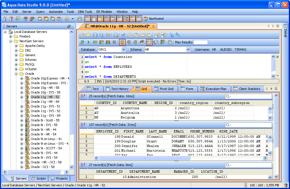 The Query Analyzer provides several different query results tools: Text Results, Oracle DBMS_OUTPUT, Text History Results, Grid Results, Pivot Grid Results, Form Results, Execution Plan, Client Statistics, and Script Details. Once a query has been executed within the Query Analyzer, the results display in a pane at the bottom of the Query Window with tabs for each result type (when enabled). The various results tabs are hidden or dsiplayed by clicking the results icons in the Main Application Toolbar or selecting them underneath the Main Application Query Menu. The Results Tabs in the Results Pane can be rearranged by dragging them into new positions. |