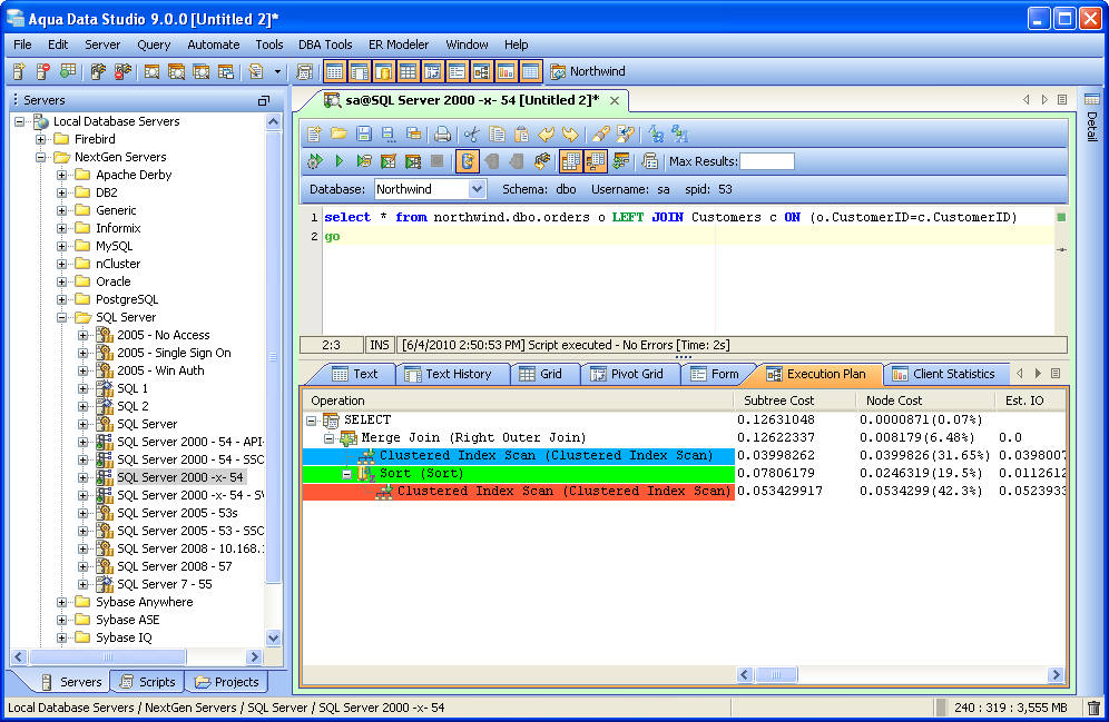 Execution Plan - Execution Plans display detailed statistics on the execution cost of the statement or script. A color coded visual execution plan will be generated for each query executed in the Query Analyzer. Subtree Cost, Node Cost, CPU cost, Estimated Input/Output, Estimated Rows, Executes, Argument, Type, Average Row Size, Defined Values, Output List, Warnings, Parallel, Estimated Executions, Physical Operations, Logical Operations and Statement Text are presented in a table. The contents of an Execution Plan can be added to a Visual Explain Whiteboard so that comparisons can be made to query variations. Execution Plans are extremely useful in query tuning for speed optimization. Read more about Execution Plans and the Visual Explain Whiteboard here. |