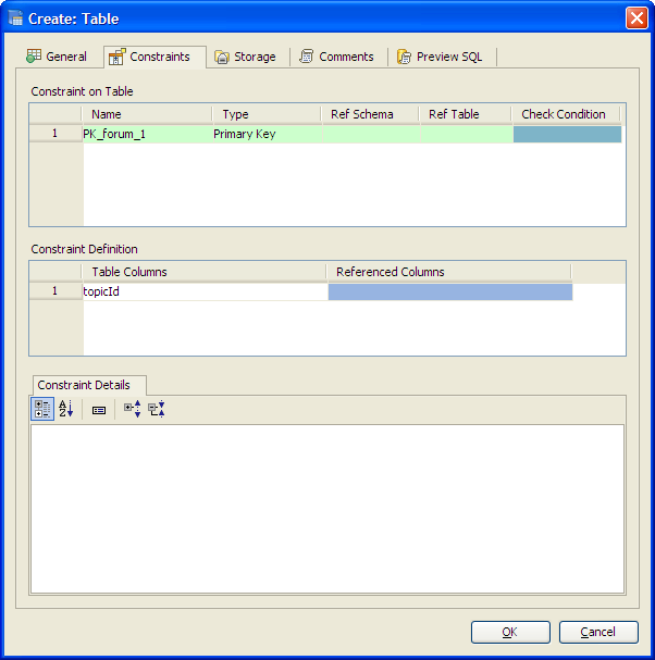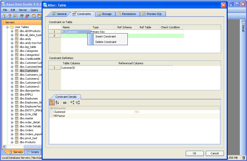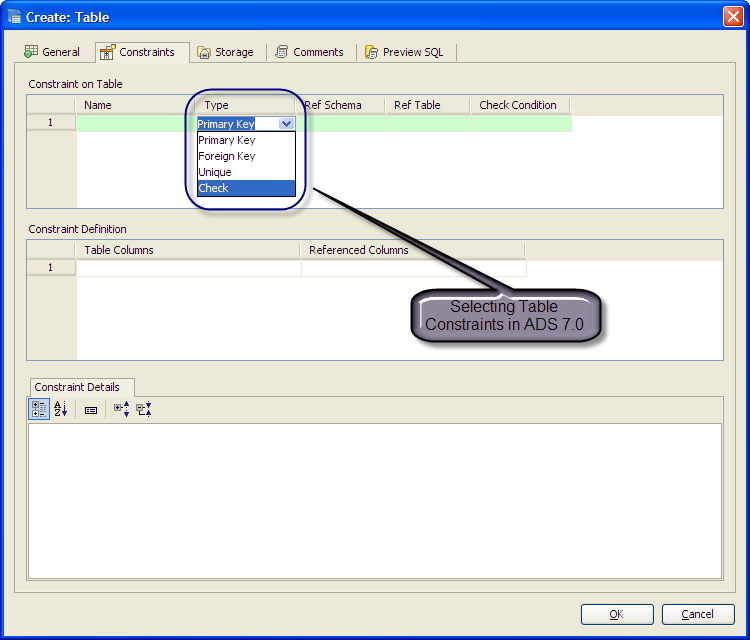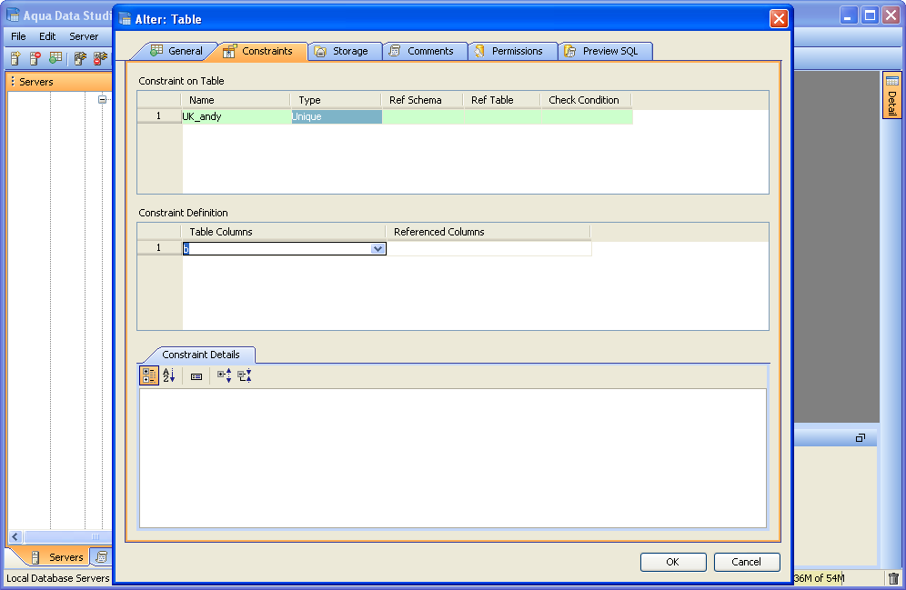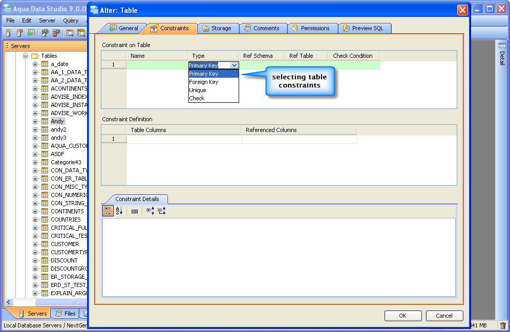 Aqua Data Studio provides visual editors for creating and editing database table Constraint objects. Constraints can be visually edited through the Create Table and Alter Table property windows, launched from a right click in the Schema Browser. Within the Alter and Create Table property windows, the Constraints Tab allows selection and editing of Table Constraints for Primary Key Constraints, Foreign Key Constraints, Unique Constraints and Check Constraints. After constraints have been set in the Constraints Tab, the Preview SQL tab displays the DDL used to generate them. When ER Models are generated from databases in the Schema Browser, constraints are visible within table entity objects. Primary Key Constraints A Primary Key is a candidate key to uniquely identify each row in a table. A table is allowed one Primary Key constraint, and a column that is part of the Primary Key constraint cannot take null values. Because Primary Key constraints ensure unique data, they are most often defined on an identity column. To create a Primary Key Constraint, enter a Primary Key Name in the name column of the Constraints table, then select Primary Key from the Type Column dropdown. In the Constraint Definition pane, select the table columns from the table that are part of the Primary key. A Primary Key Constraint is represented by a table icon with gold node when viewed in the Constraints container in the Schema Browser. Foreign Key Constraints A Foreign Key is a referential constraint between two tables. The foreign key identifies a column or a set of columns in one (referencing) table that refers to a column or set of columns in another (referenced) table. The columns in the referencing table must be the primary key or other candidate key in the referenced table. The values in one row of the referencing columns must occur in a single row in the referenced table. To create a Foreign Key Constraint, enter a Foreign Key Name in the name column of the Constraints table, then select Foreign Key from the Type Column dropdown. Select the Reference Schema and Reference Table. In the Constraint Definition pane, select the columns from the tables that are set in the Reference Table of the Foreign Key. A Foreign Key Constraint is represented by a table icon with gold node and black square when viewed in the Constraints container in the Schema Browser. Unique Constraints A Unique Constraint uniquely identifies all possible rows that exist in a table. Unique Constraints make sure that no identically copied values are entered in specific columns that do not participate in a primary key. Multiple Unique Constraints can exist on a single table. To create a Unique Constraint, enter a Unique Constraint name in the name column of the Constraints table, then select Unique Constraint from the Type Column dropdown. In the Constraint Definition pane, select the columns from the columns needed. A Unique Key Constraint is represented by a table icon with crossed node when viewed in the Constraints container in the Schema Browser. Check Constraints A Check Constraint (also known as table check constraint) is a condition that defines valid data when adding or updating an entry in a table of a relational database. Within the Constraints Tab of Create or Alter Table, the Check Condition column is where the condition is set, determining what the table considers valid data for the selected column. To create a Check Constraint, enter a Check Constraint Name in the name column of the Constraints table, then select Check Constraint from the Type Column dropdown. Enter the formula for the check in the Check Condition field. A Check Constraint is represented by a table icon with gold node and green check when viewed in the Constraints container in the Schema Browser. Sample Table with Constraint Types The screenshot labeled "Table with constraint types" shows the Alter Table dialog for a table from the AdventureWorks database in Microsoft SQL Server 2008. |