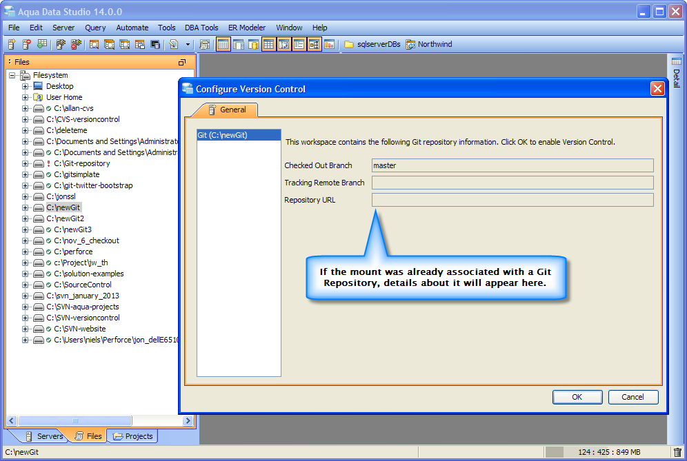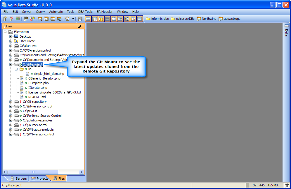 To mount and use a directory that is already part of a Git repository Step 1: Mount the Directory in the Aqua Data Studio Filesystem Tree View