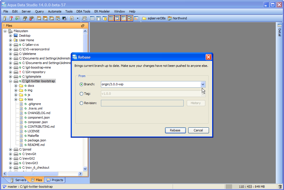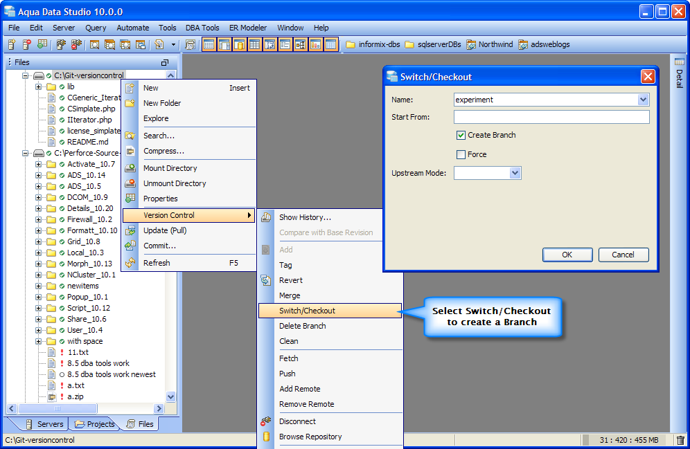 Now next time you try to "Push" this remote server will be available under the Destination Repository in the drop down. See step 2 in Push your changes to remote Git Repository in github, google projects, heroku, gitorious etc Create, Delete Branches, Switch and Checkout A single Git repository can contain any number of branches.To create a new branch using Aqua Data Studio follow the below steps