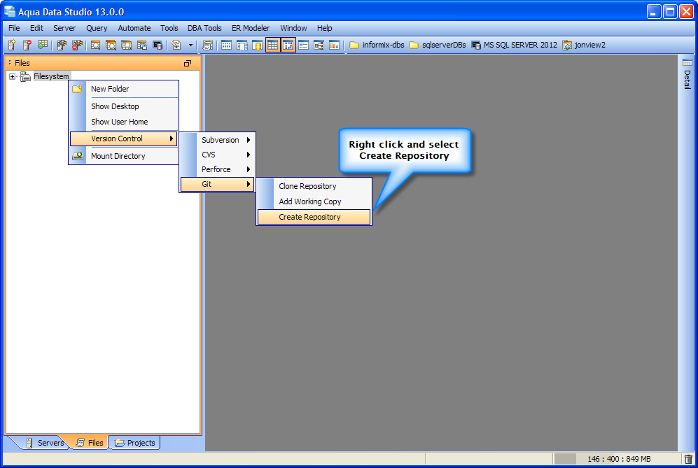 Version Control - Git Users can create a new Git repository in Aqua Data Studio and manage files or checkout remote Git projects hosted in Google Code Project Hosting, Github, Gitorious, Heroku etc. Users can also interact with the Git Command Line Options using the Open API interface AQGit under com.aquafold.openapi.vcs in the AquaScript editor. The Git Client offers a convenient UI for all of Aqua Data Studio's Git administrative and management capabilities, including some that are not possible through right click context menus in the Files Browser such as creating, applying and deleting Stashes. To launch the Git client, right click on an existing mount in the Files Browser that contains a Git Repository. Your first GIT Repository using Aqua Data Studio With Aqua Data Studio, you can create a GIT repository and be up and running in 1 easy step Set up a GIT repository (bare)