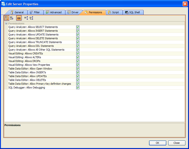 Edit the Permissions in Server Properties in Aqua Data Studio:
