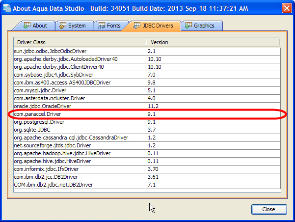 The ParAccel Analytic Platform JDBC (v9.1) drivers included with Aqua Data Studio work with ParAccel 4.x, 3.1 and 3.5. ParAccel Analytic Platform server releases are frequent, and may sometimes require updating the JDBC driver.