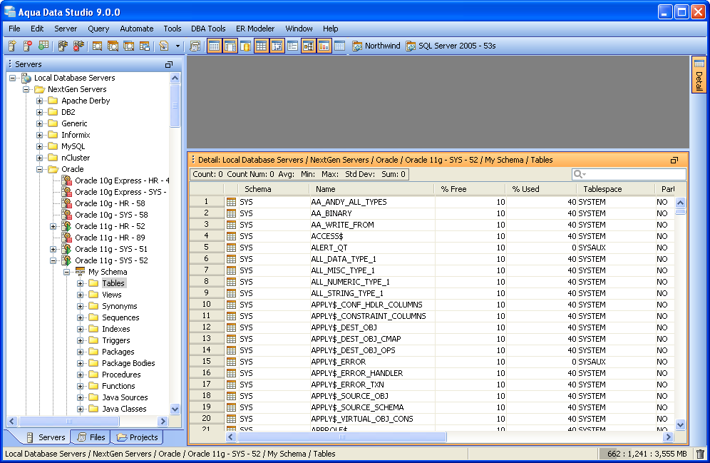 The button on the right hand side of the Query Window marked "Detail" turns on and off the Detail View. Content displayed within the Detail View varies based on the database object, vendor and version selected. Files within the Files Browser display modifcation date and time when their containing directory is selected. When several objects are selected, their details can be viewed. This makes it convenient to check offline or online status of several databases at the same time, or see the modification dates on files within a directory.