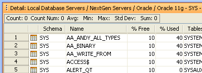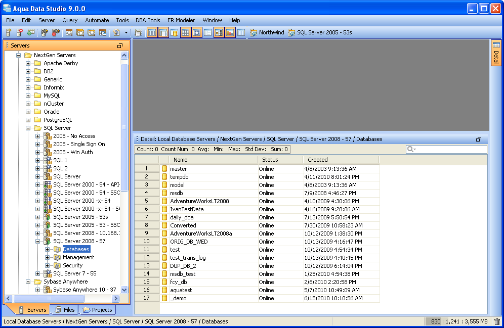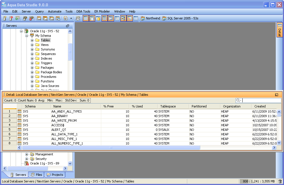 The button on the right hand side of the Query Window marked "Detail" turns on and off the Detail View. Content displayed within the Detail View varies based on the database object, vendor and version selected. Files within the Files Browser display modifcation date and time when their containing directory is selected. When several objects are selected, their details can be viewed. This makes it convenient to check offline or online status of several databases at the same time, or see the modification dates on files within a directory.
